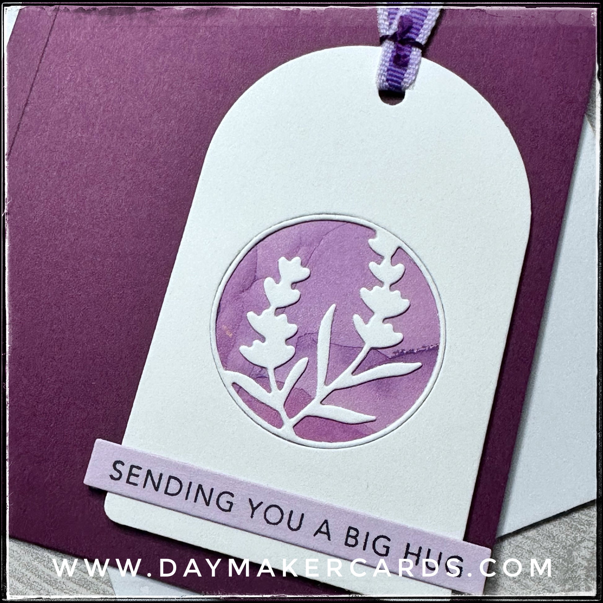"Sending you a big hug" is stamped in black ink on a thin lavender strip which coordinates with the background color shown behind the floral die-cut. The tag is elevated off of the card base with dimensional adhesive and coordinating shades of purple complete the ribbon accent. Two intersecting thin hand-drawn lines add detail on the top and left sides of the card front.