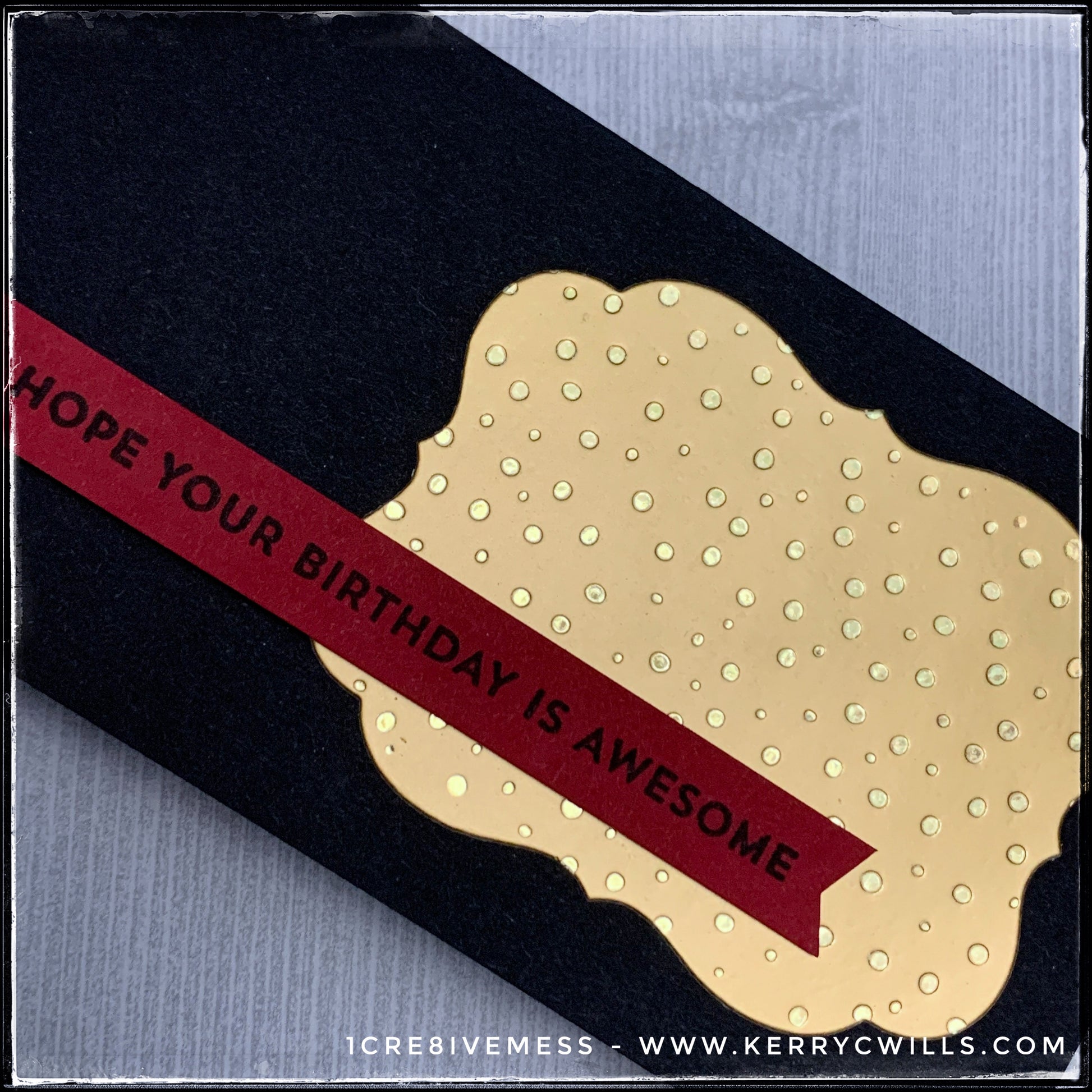 A flat matte gold die-cut is embellished with a sparkly gold polka dotted pattern that has a slight debossed texture to it on this handmade birthday card. A narrow red banner features the sentiment "hope your birthday is awesome" and is stamped in black ink to coordinate with the color of the card base.