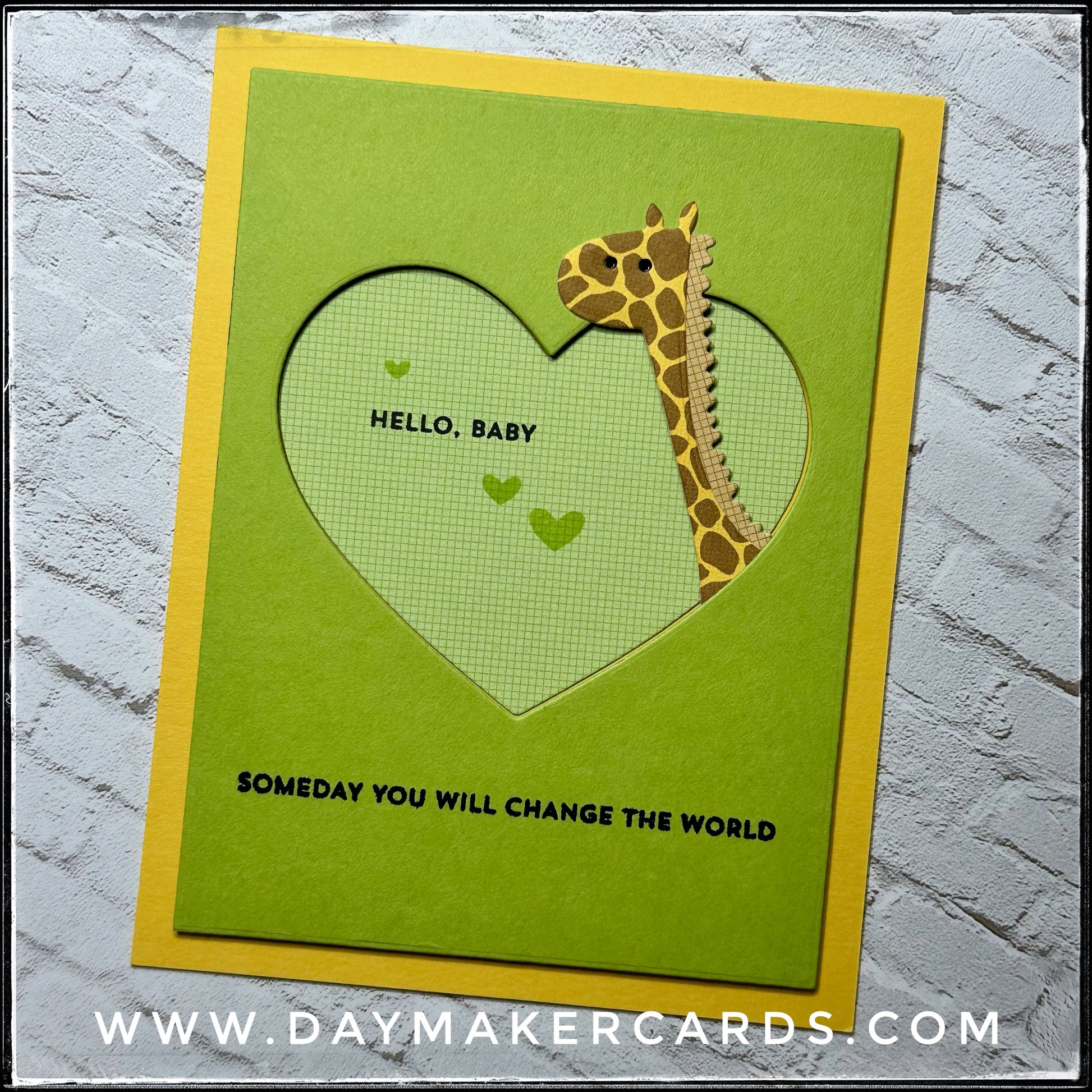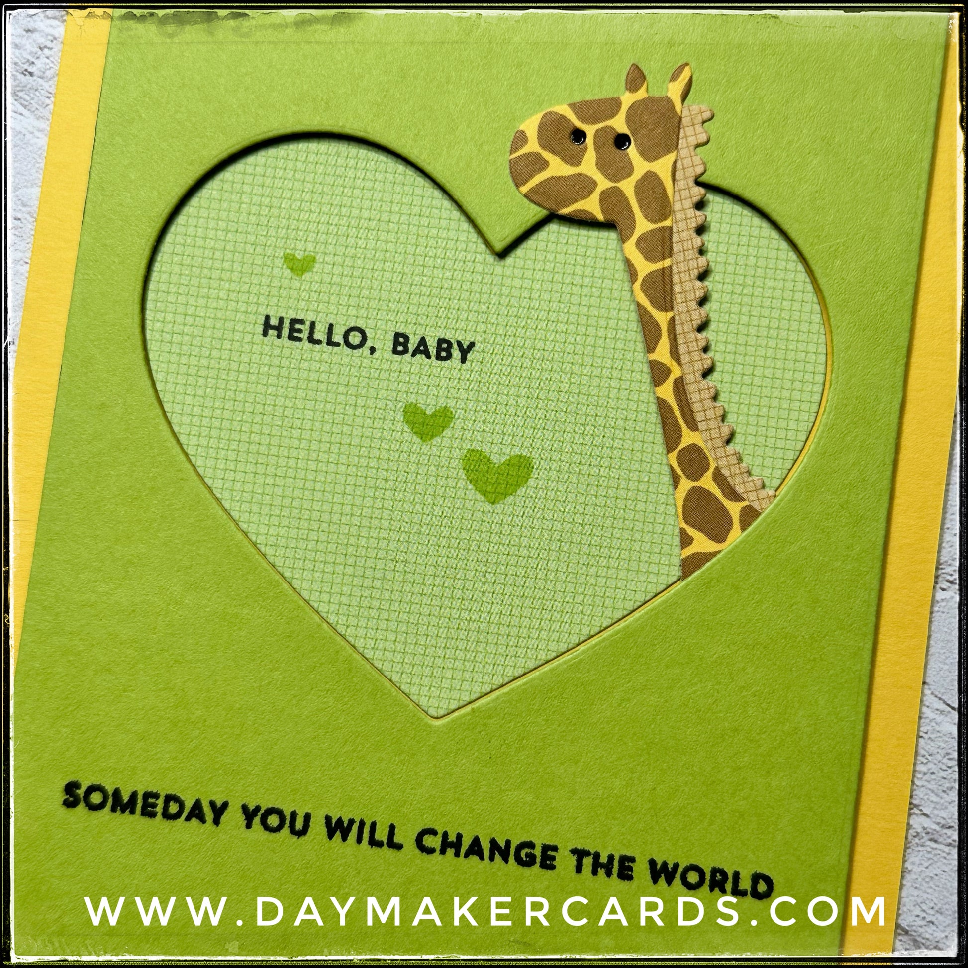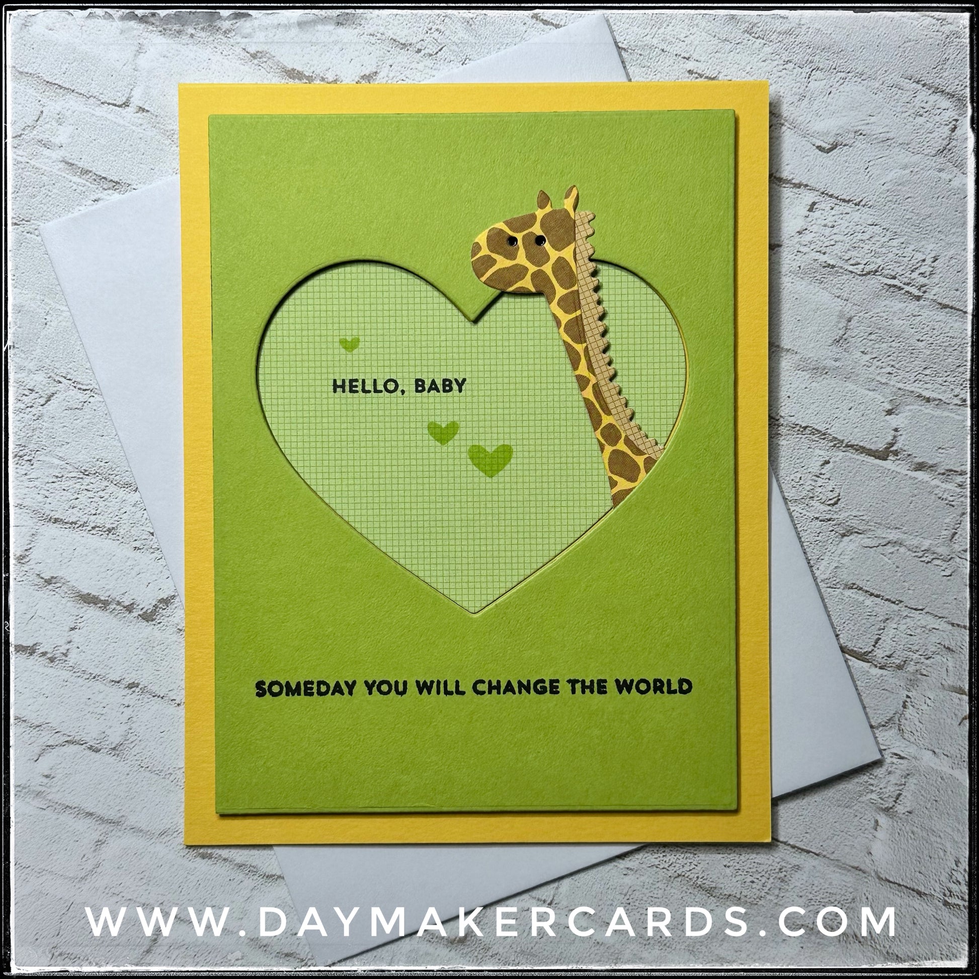 An adorable die-cut giraffe pokes his head out of a heart opening while showcasing varying levels of dimension. "Hello baby" is stamped in black ink inside the heart, along with a trio of stamped green hearts. "Someday you will change the world" is also stamped in black ink near the bottom of the card front. A gender-neutral color scheme makes this a wonderful option for any new tiny human.