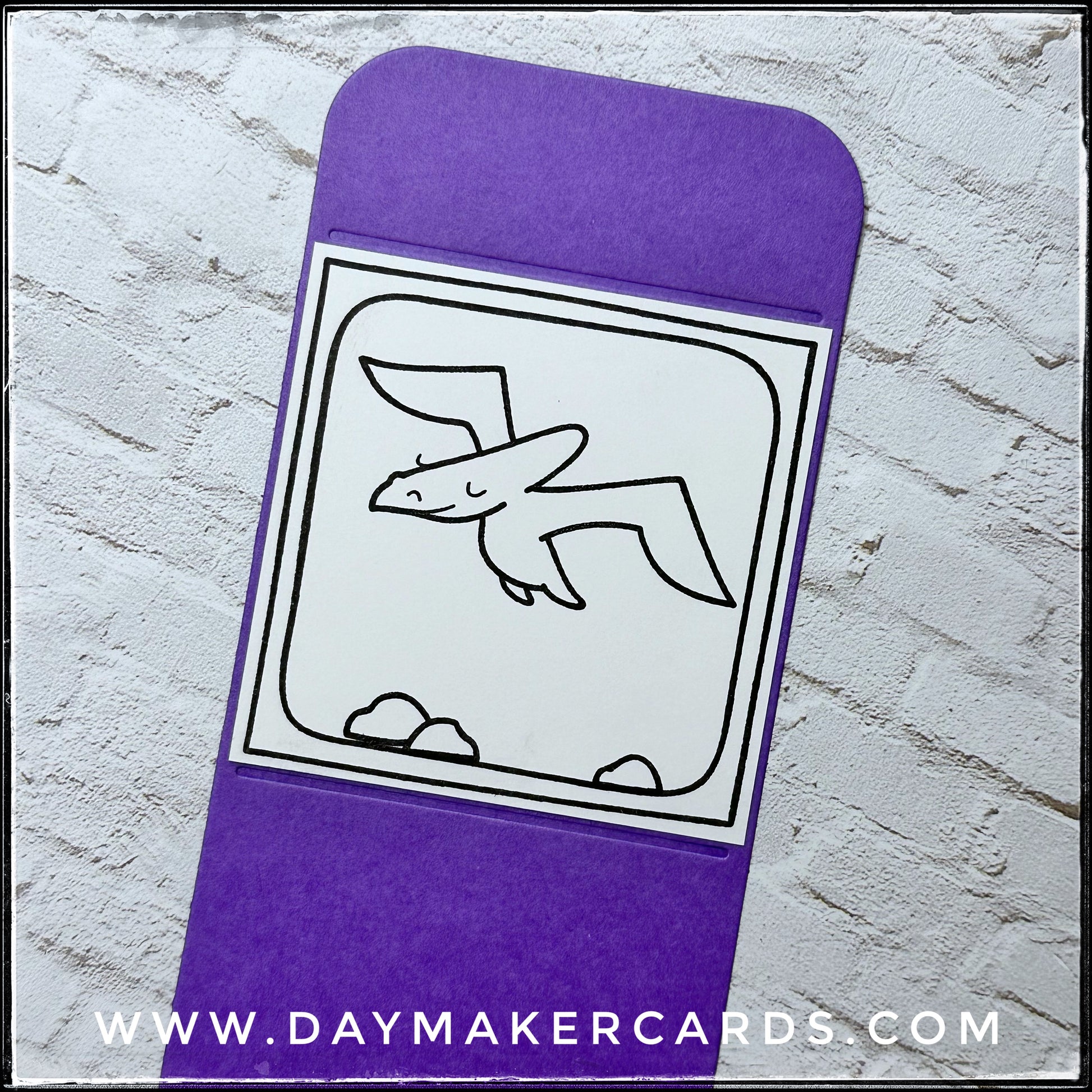 Designed to be colored - by either the sender or the receiver, this lunchbox note features a dinosaur flying through the skies.