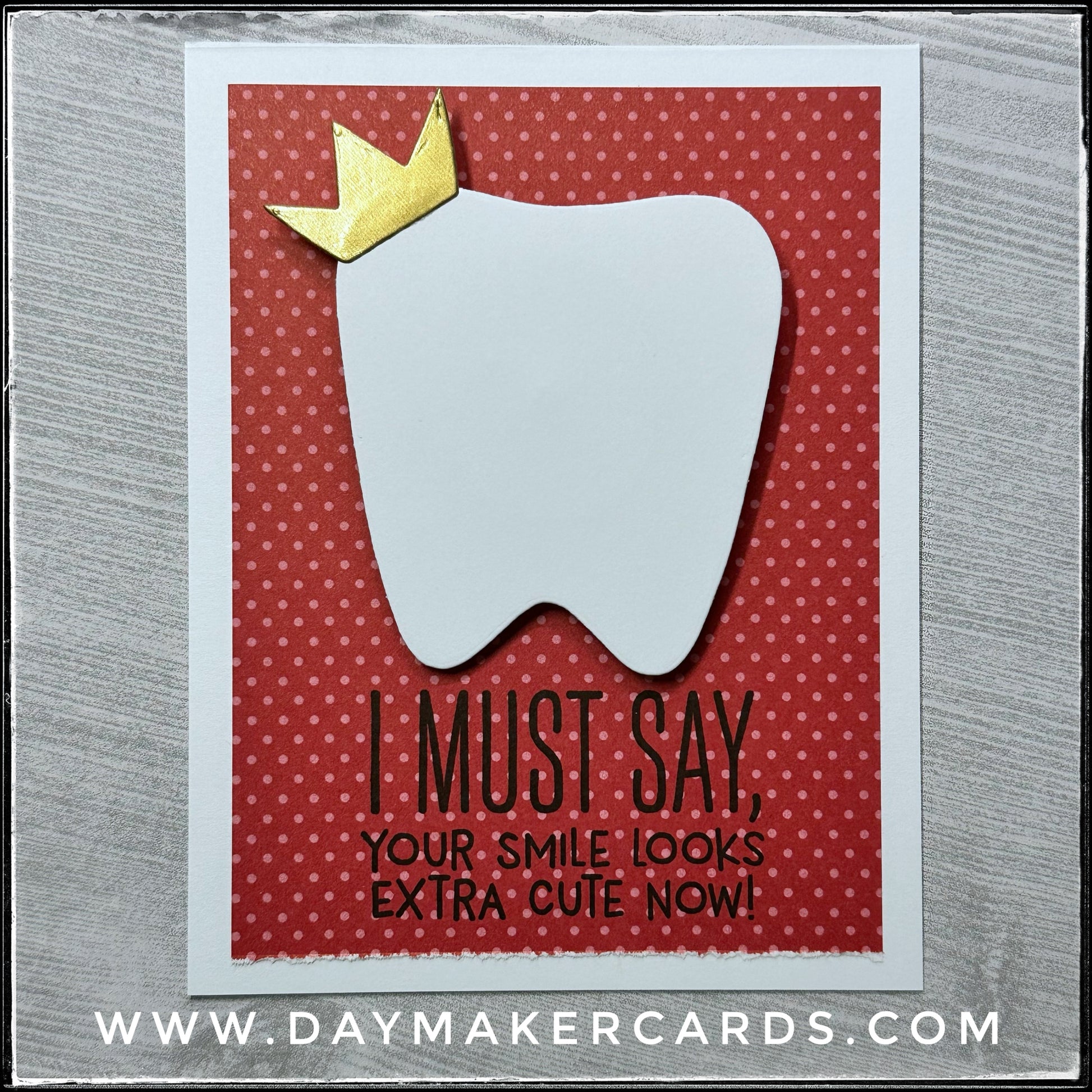 A polka dotted background sits under the tooth that's wearing a crown, along with the stamped sentiment "I must say, your smile looks extra cute now!" in black ink.