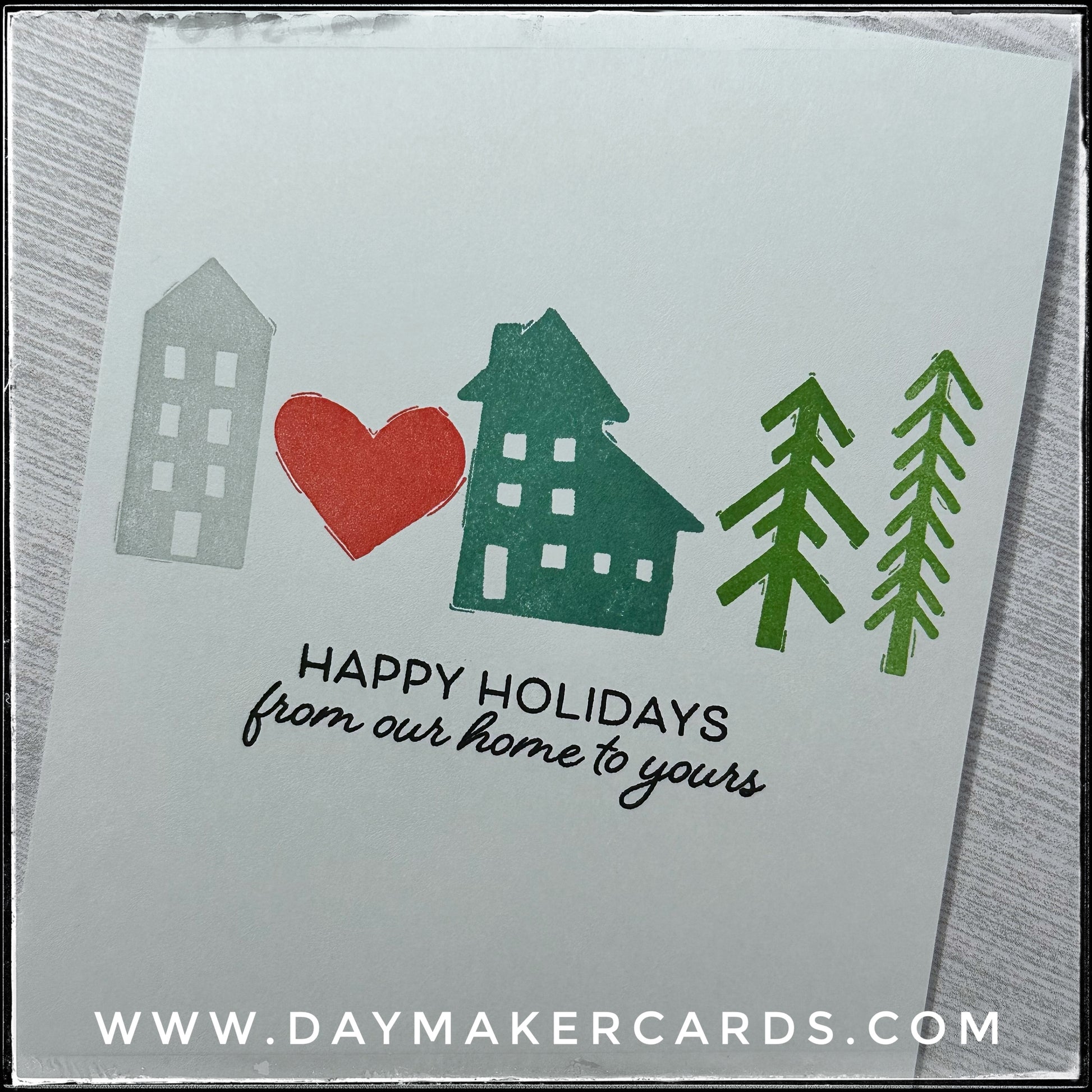 "Happy Holidays from our home to yours" is stamped in black ink on the front of this one layer handmade card. Two houses are separated by a heart and are surrounded by trees and the entire card is full of good cheer.