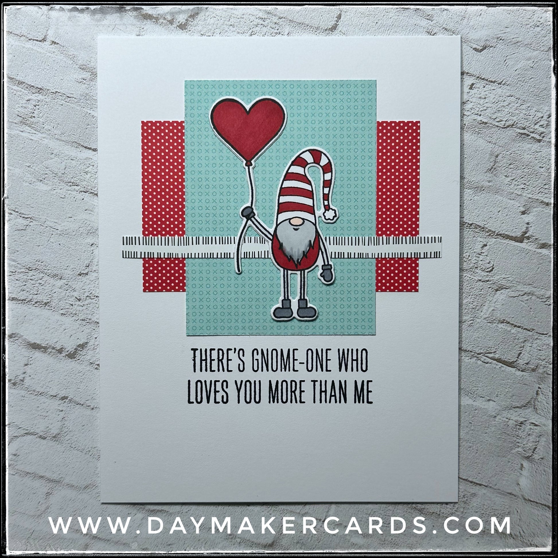 A background designed with blocks of patterned paper houses a die-cut and hand-colored gnome holding a large heart balloon. The sentiment "There's gnome-one who loves you more than me" is stamped in black ink beneath the scene. Perfect to be used for a valentine or a loved one on any random day.