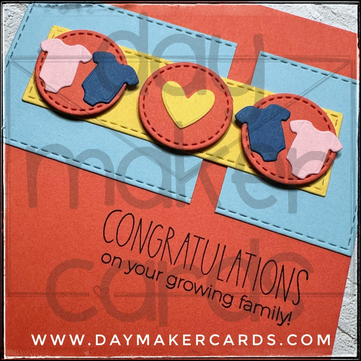 A strip of yellow paper holds three die-cut circles that are elevated with dimensional foam adhesive. The middle circle holds a small heart and the circles on either side feature blue and pink onesies. The sentiment is stamped in black ink and reads "Congratulations on your growing family".