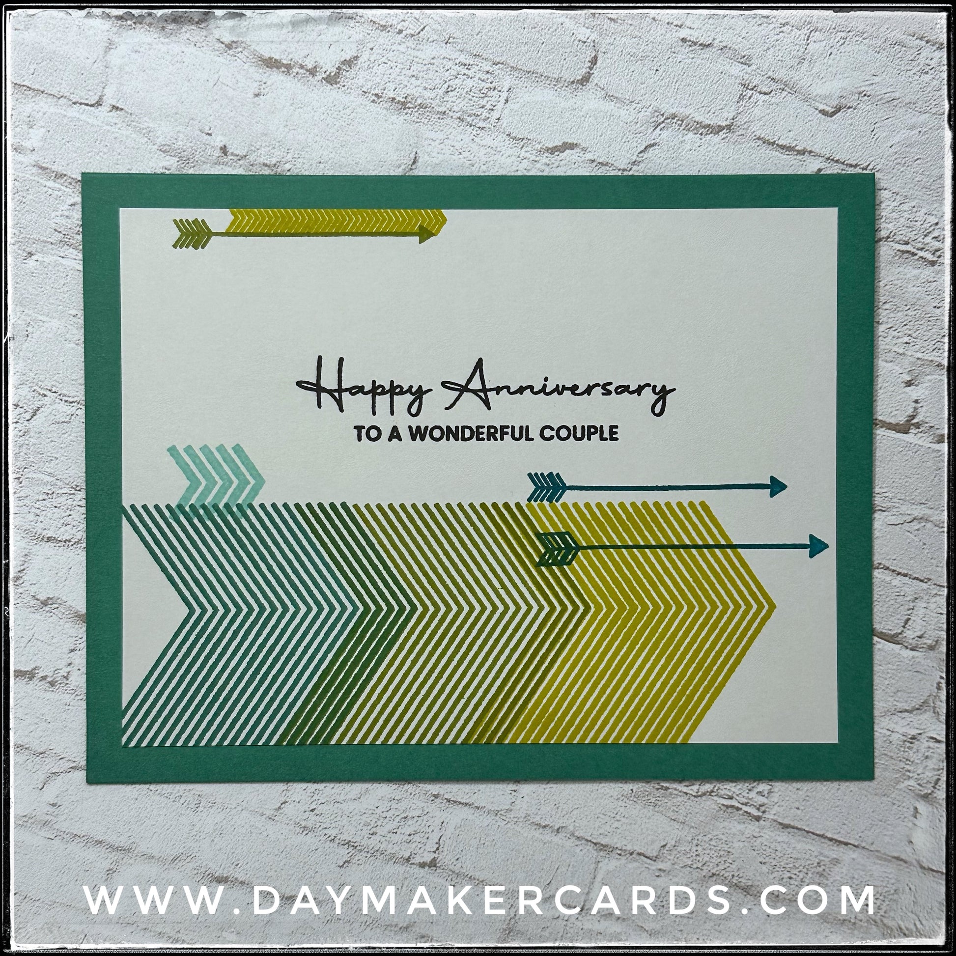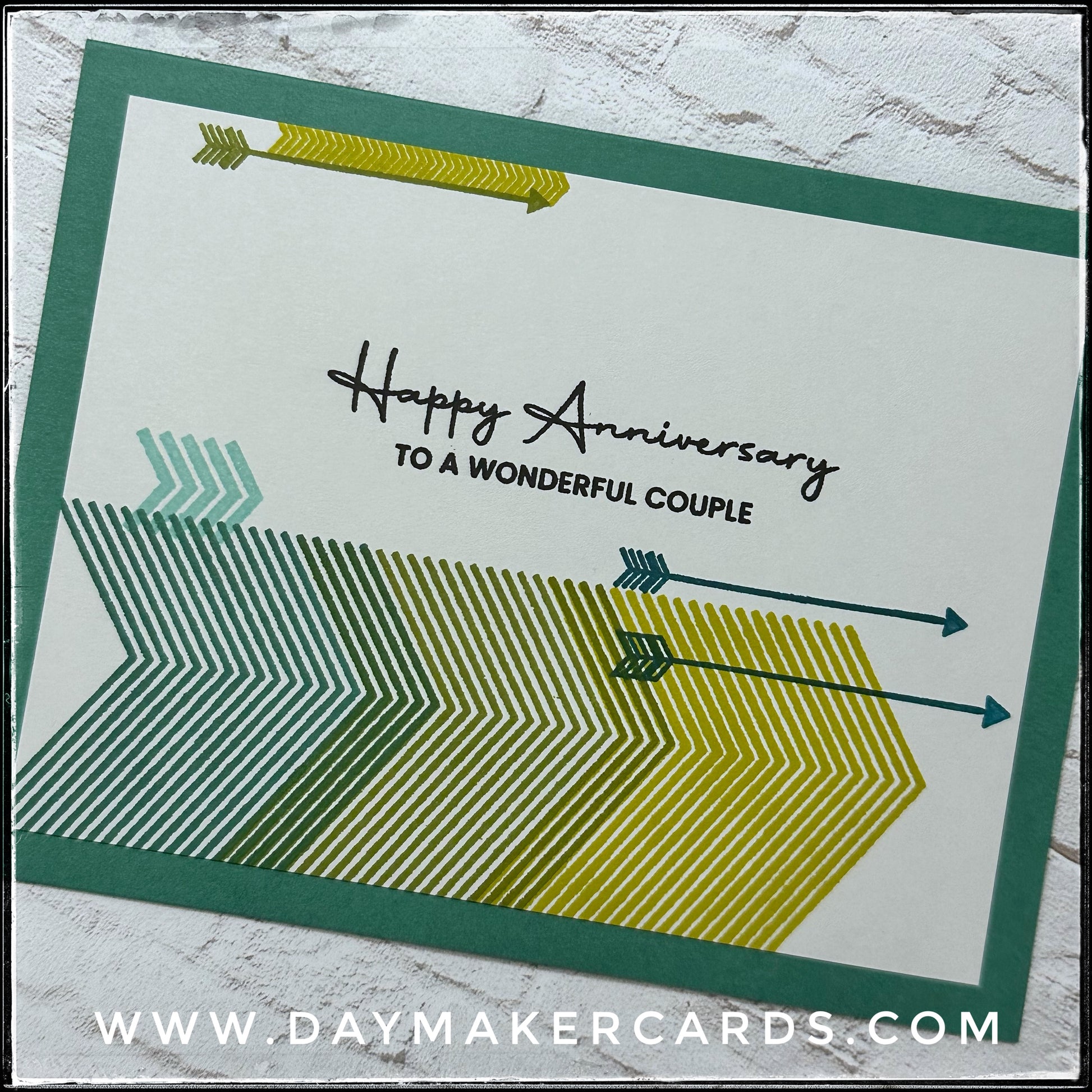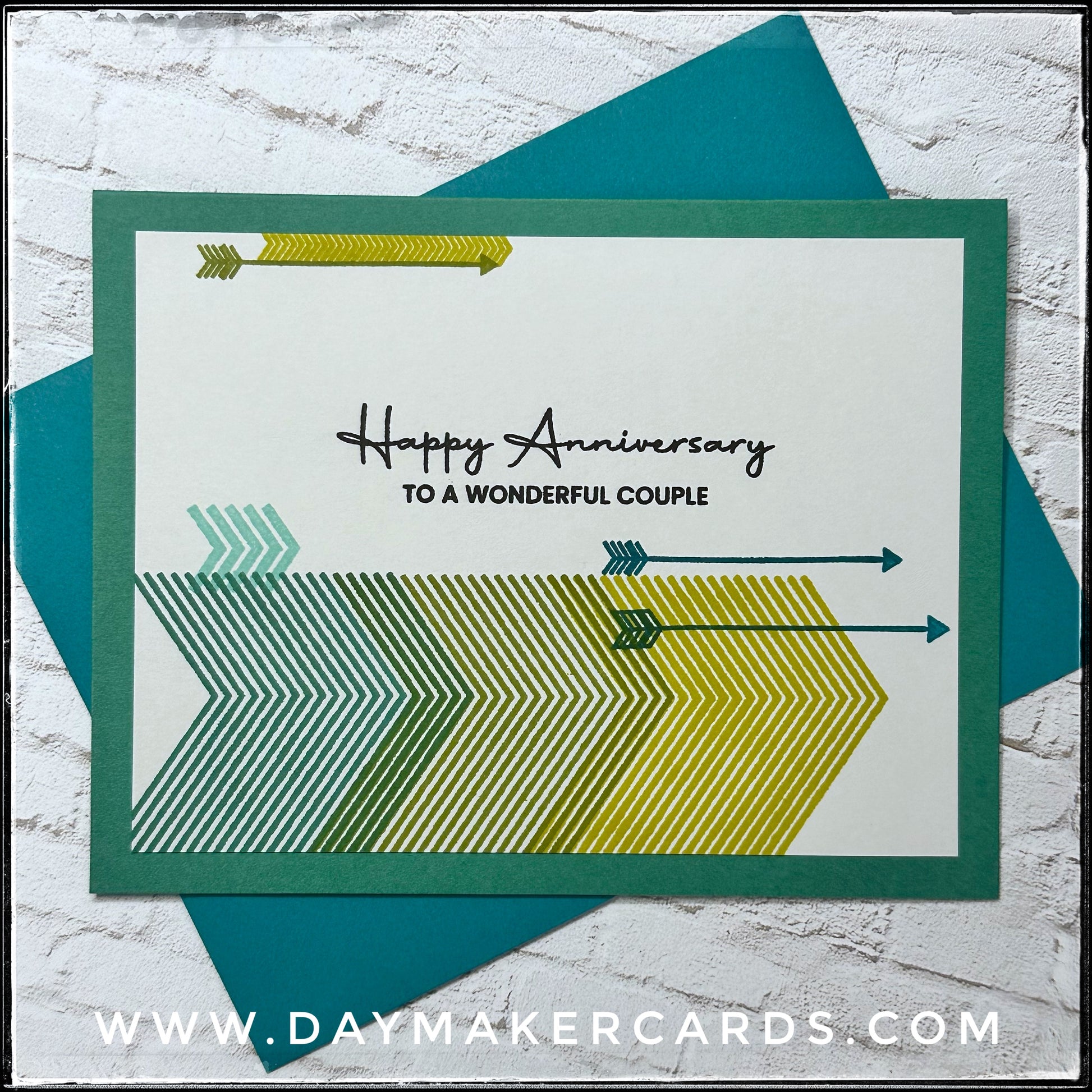 This handmade card is full of color, lines and well-wishes for a happy anniversary. Shades of green, aqua and teal fill the card front in chevron patterns. The sentiment "Happy Anniversary To A Wonderful Couple" is stamped in black ink.