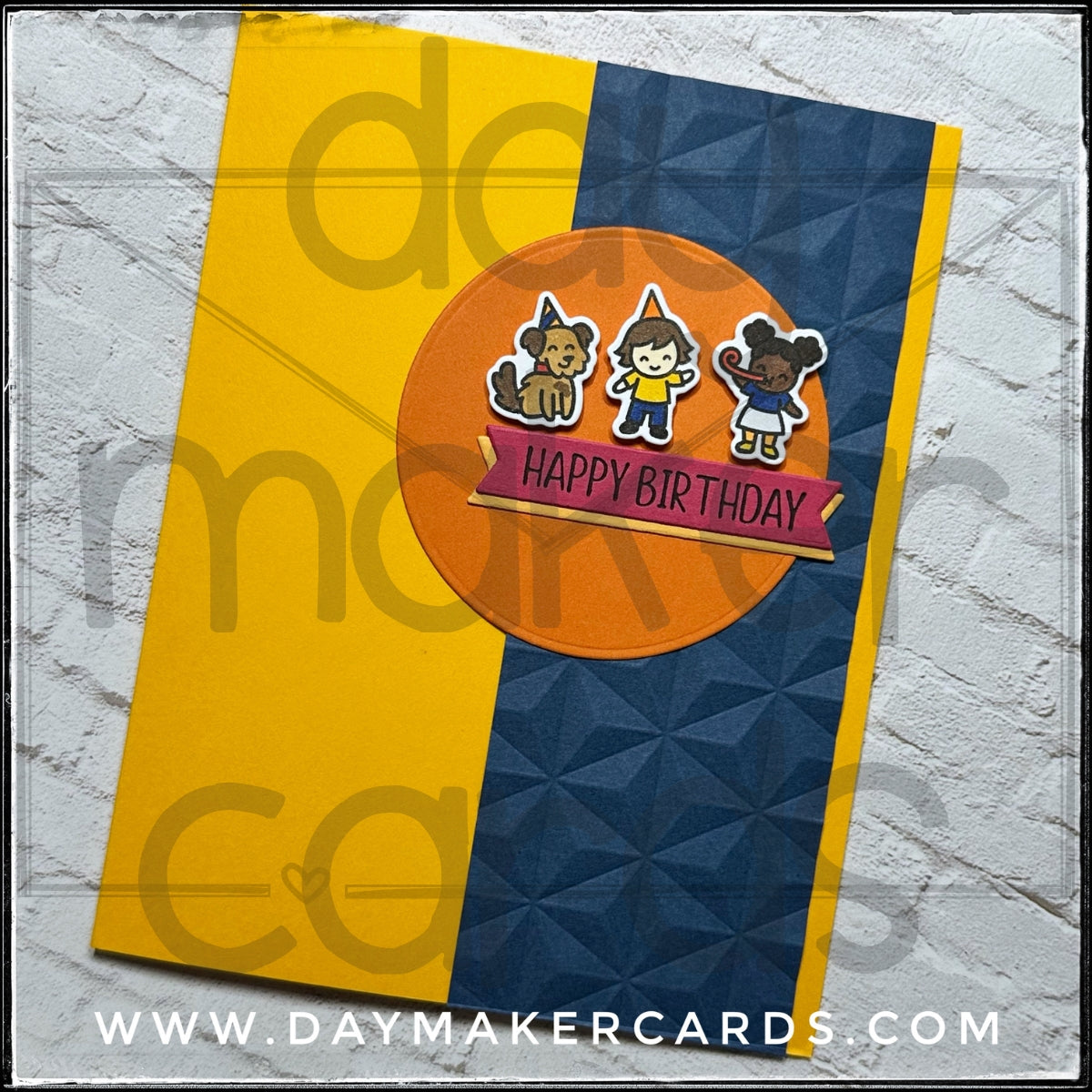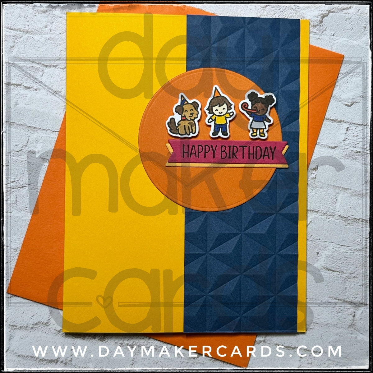 A dark blue panel dry embossed with a geometric texture fills the right side of the card front. Layered on top of a die-cut circle are a trio of tiny stamped, die-cut and colored characters above the sentiment "happy birthday" that has been letterpressed in black ink.