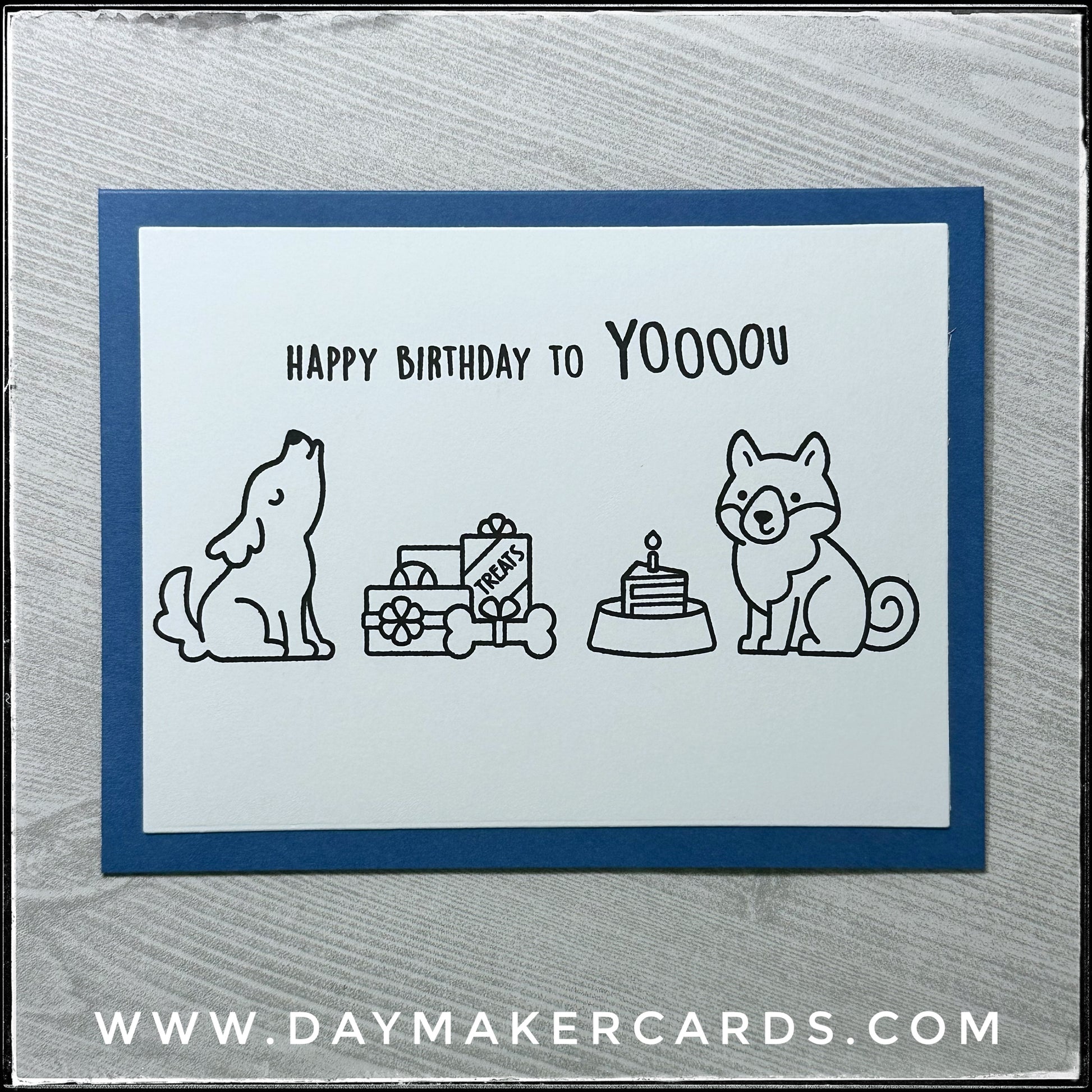 Two friendly pups are accented by a dog bowl full of cake [with a candle of course!] and a stack of presents. The images are stamped in black ink on a white card panel, made of heavy cardstock. The sentiment "Happy Birthday To Yooou" is stamped above the design in black ink.