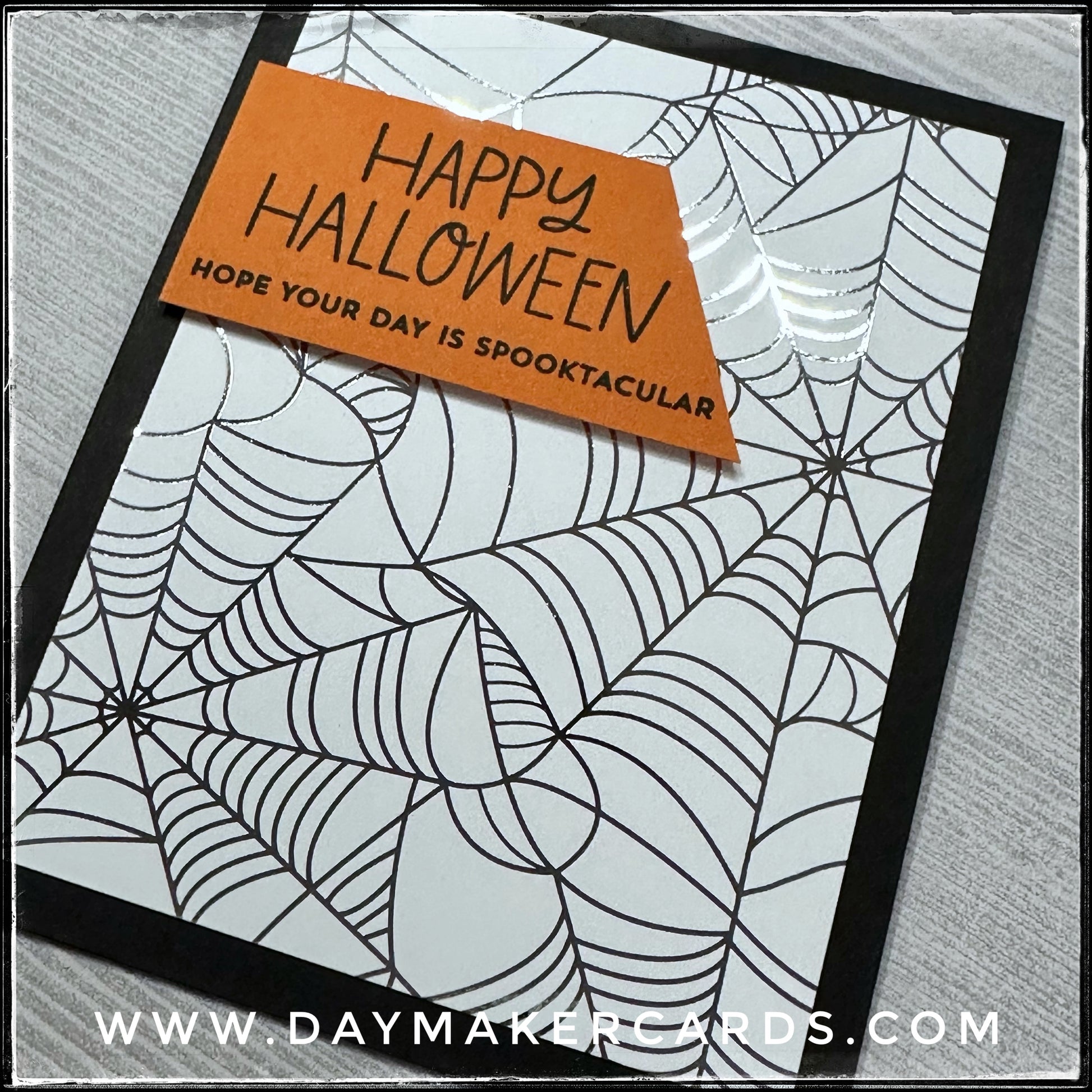 This handmade card features a fantastic foiled background in a bold silver that is super reflective. A banner elevated off of the left side of the card front is stamped with the sentiment "Happy Halloween - Hope your day is spooktacular" in black ink.