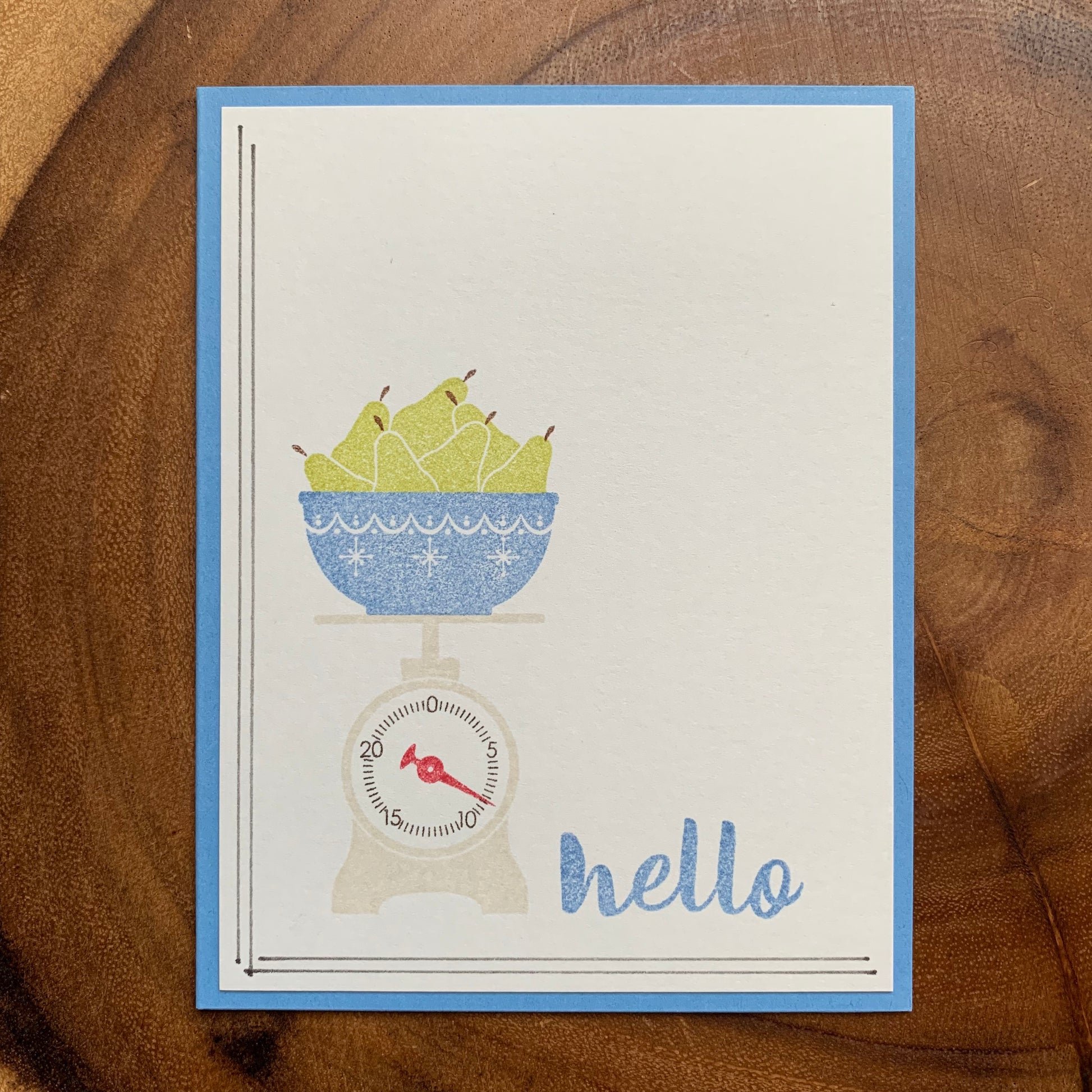 The sentiment "hello" is stamped in blue ink, matching the color of the card base. Hand drawn lines add detail across the left side and the bottom edge of the card front.