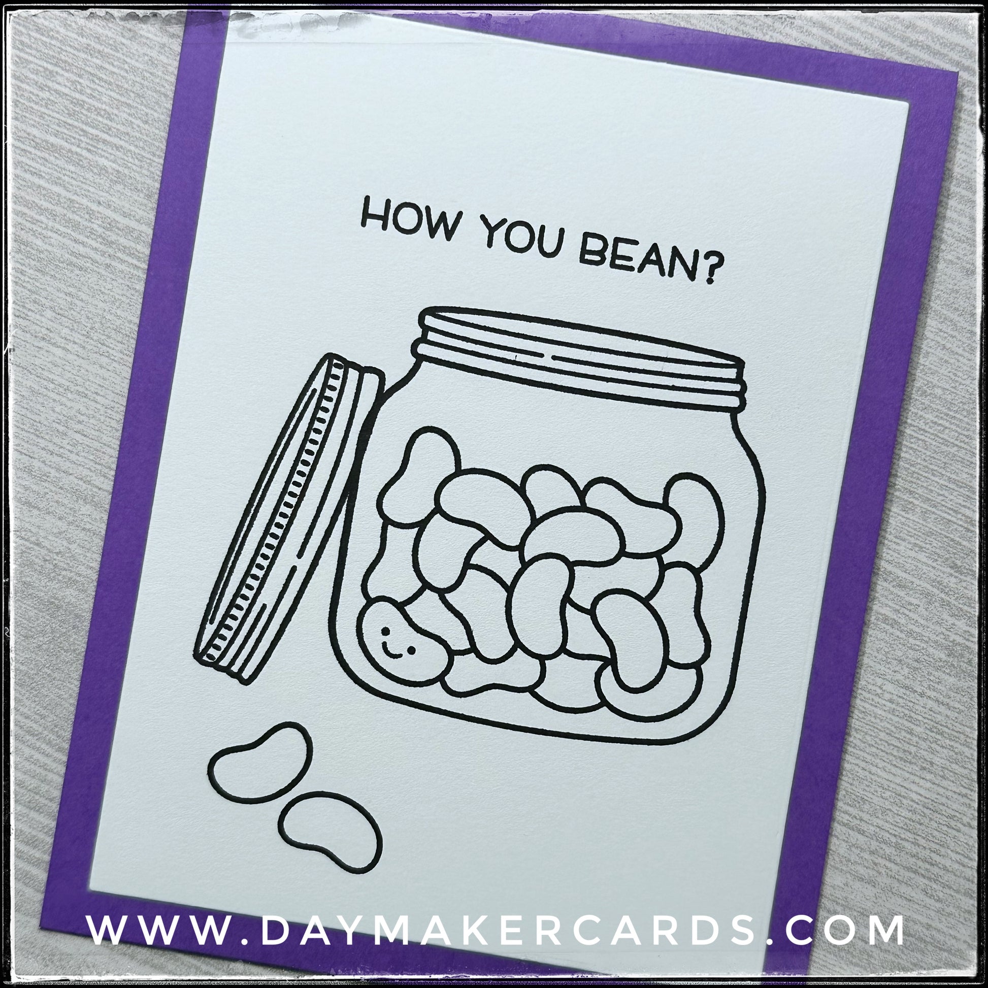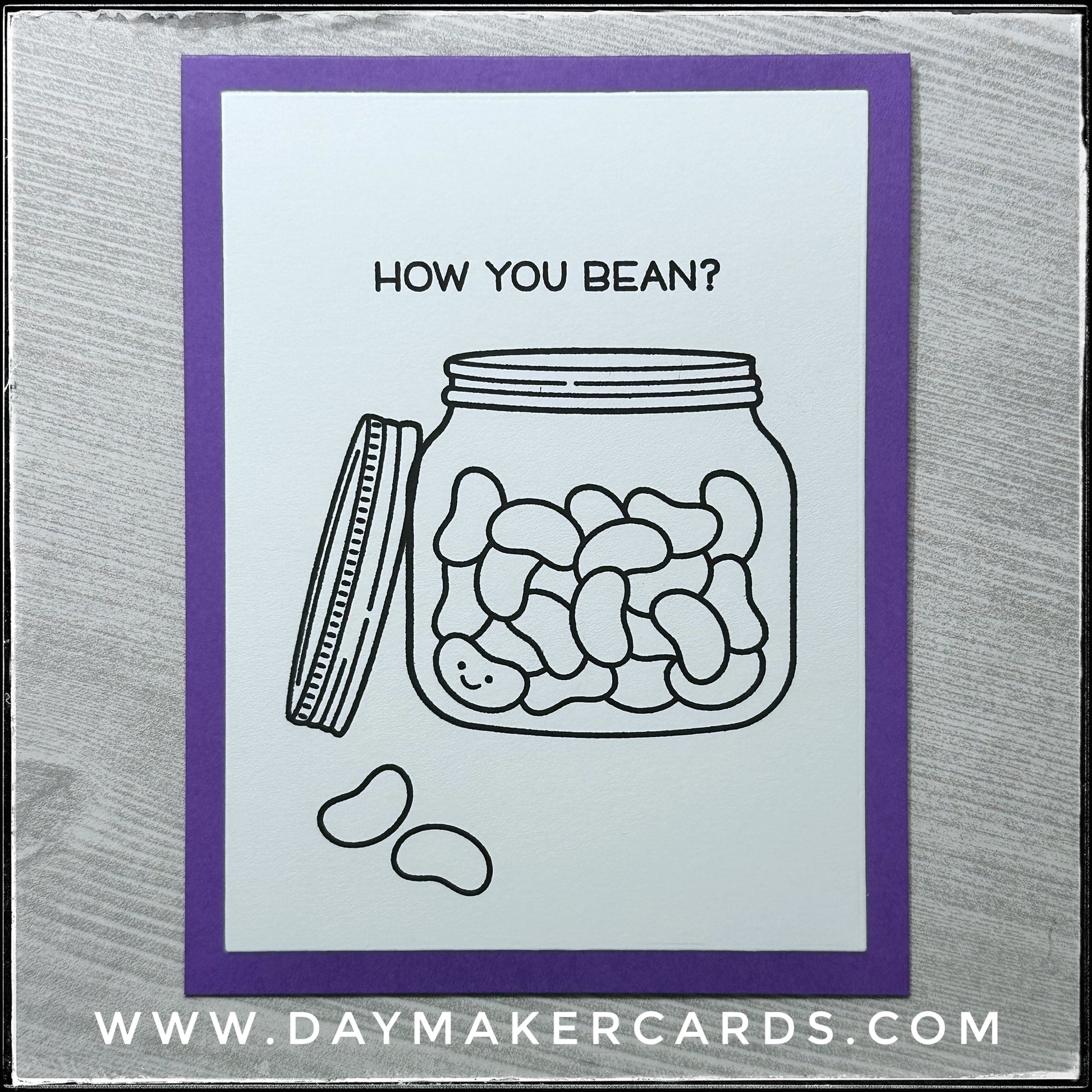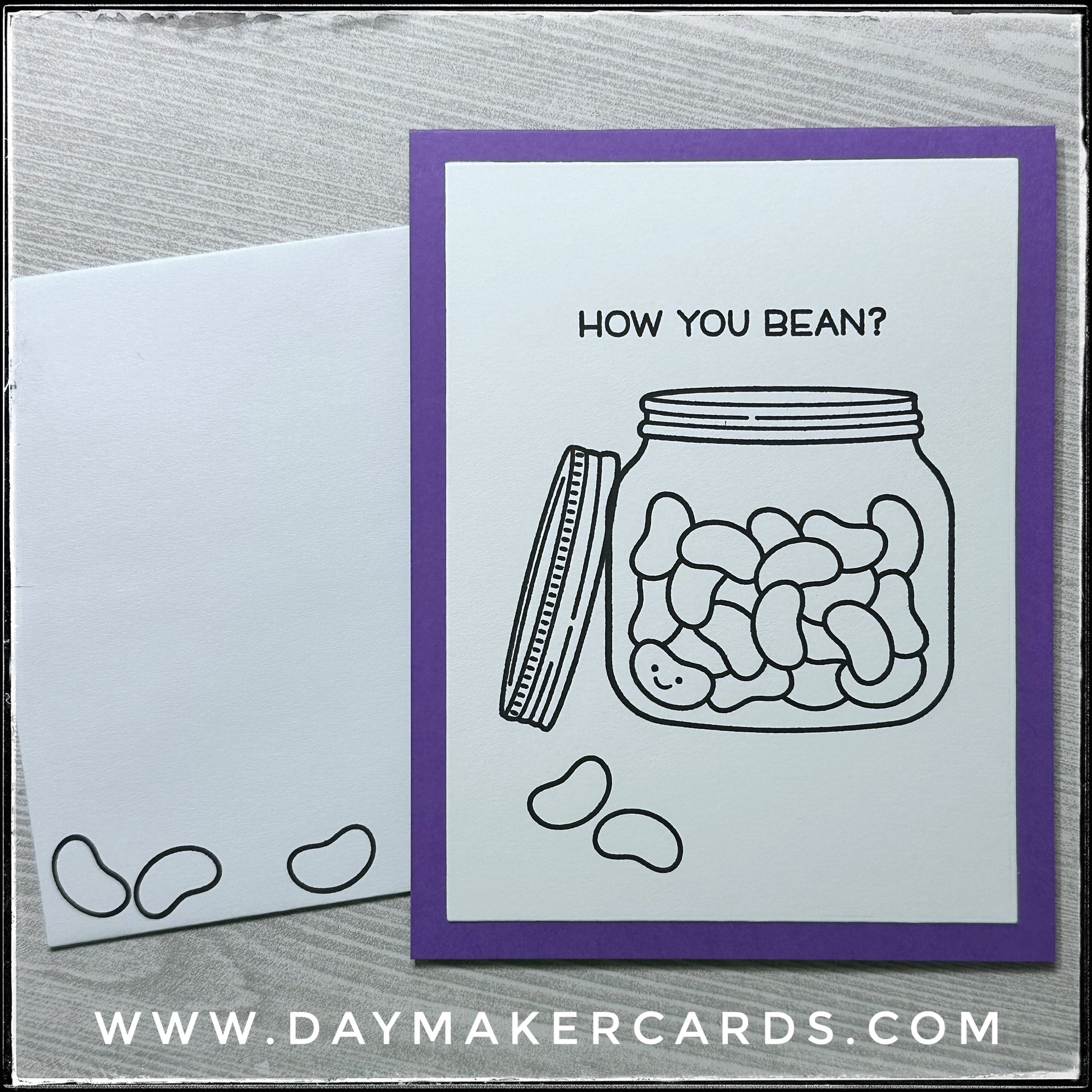 No need to count the beans inside this fun little jar, unless you want to! Full of sweet little beans, complete with a smiley face, the design is accented by a punny sentiment. "How You Bean?" is stamped in black ink and all the images are stamped on a white card panel, made of heavy cardstock. Two loose beans are about to jump off the card and are sure to make your recipient smile.