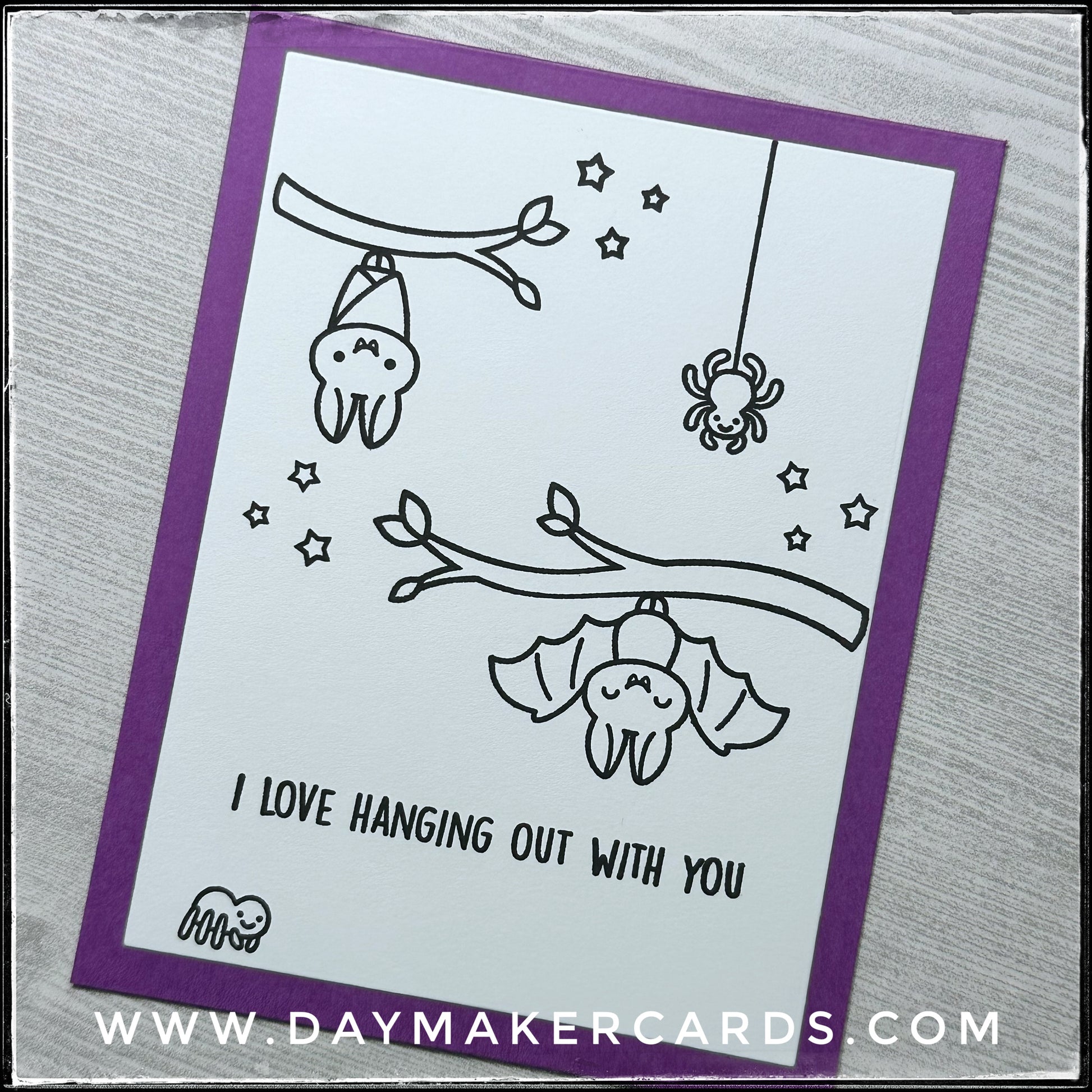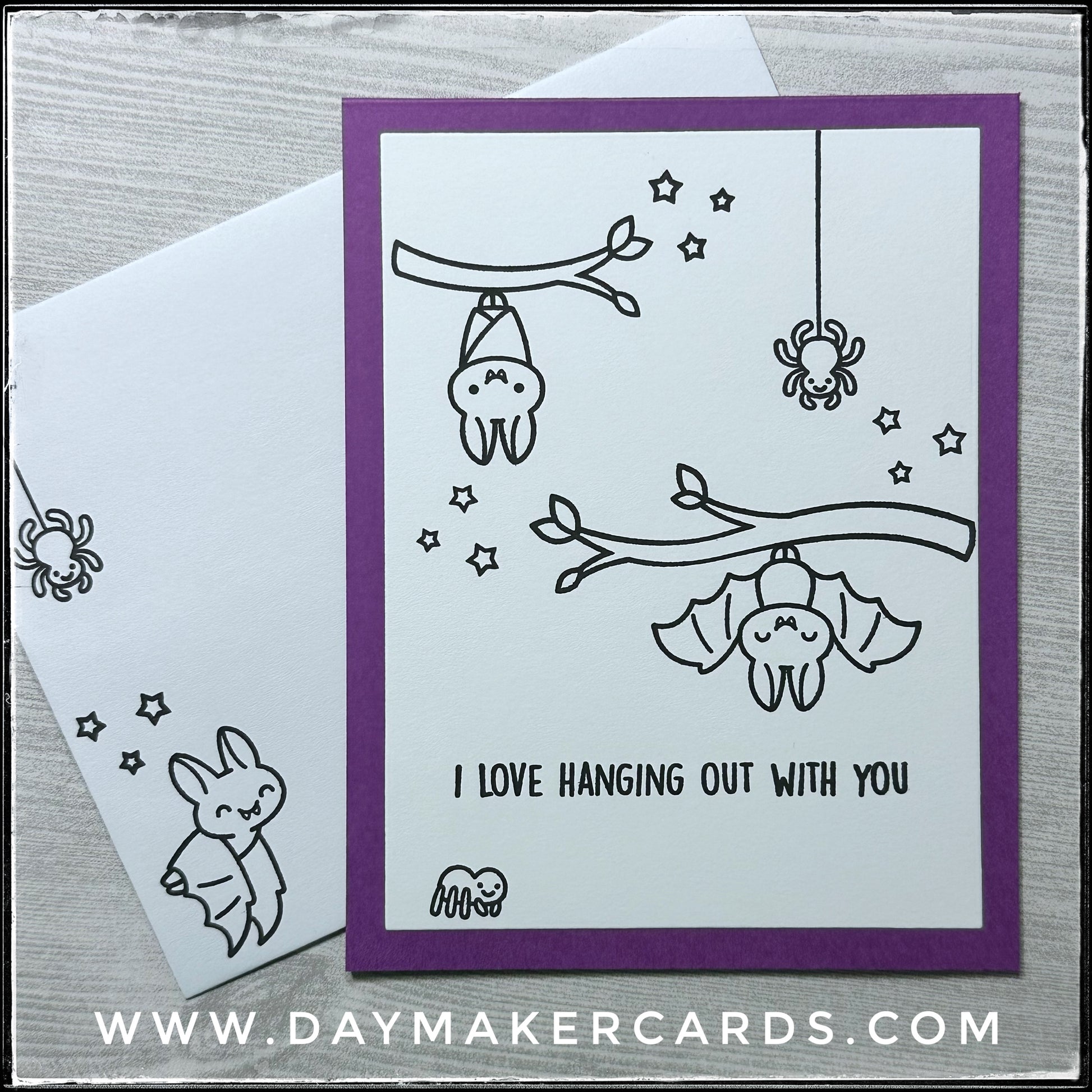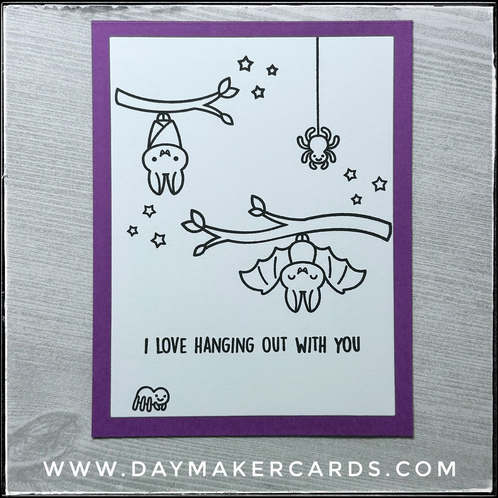 Perfect for Halloween - or any random day, this handmade card brings the pun with some adorable bats! A hanging spider floats above a bat with his wings spread out while hanging from a tree. A smattering of small stars accents the design. The sentiment reads "I Love Hanging Out With You" and is stamped in black ink. All the images are stamped on a white card panel, made of heavy cardstock.