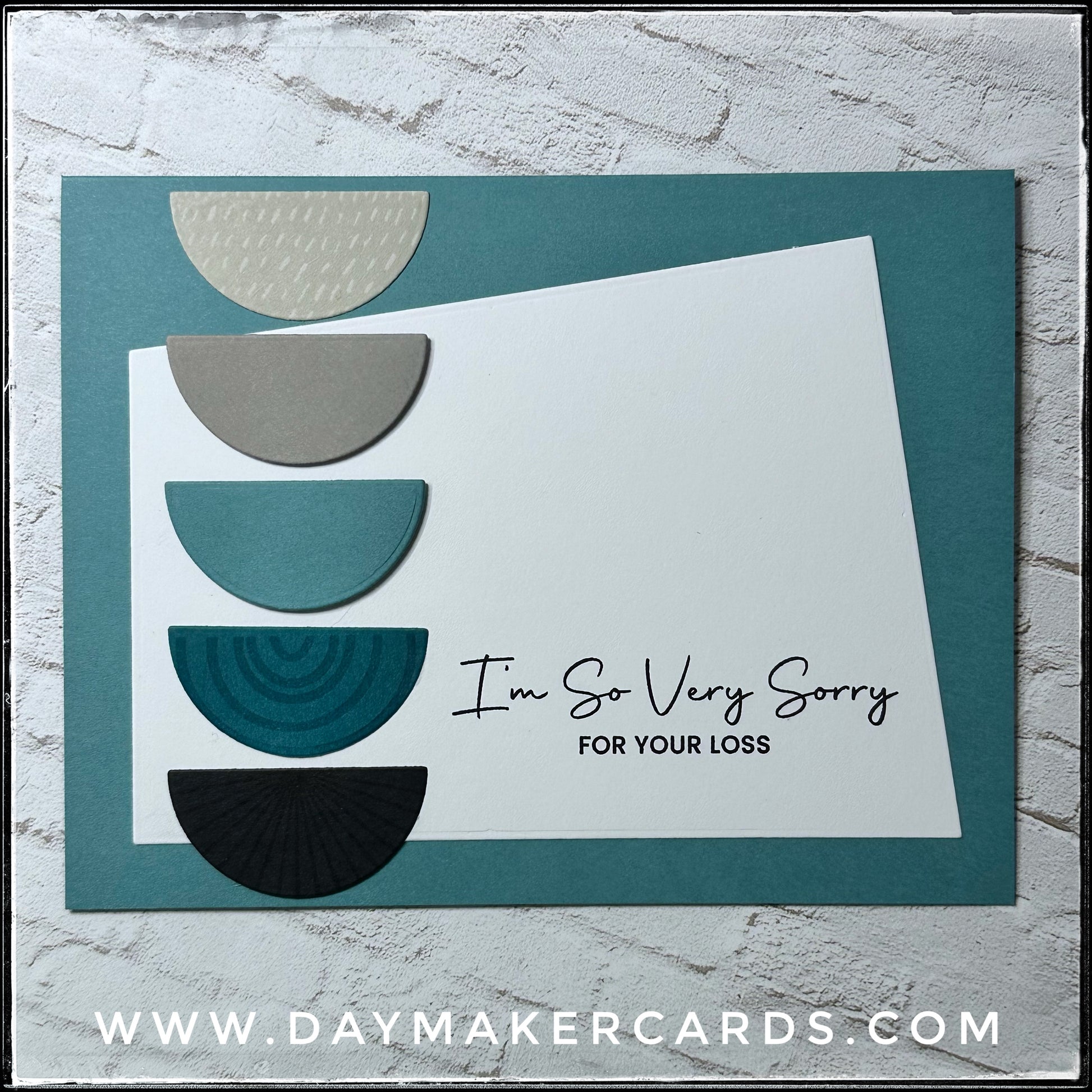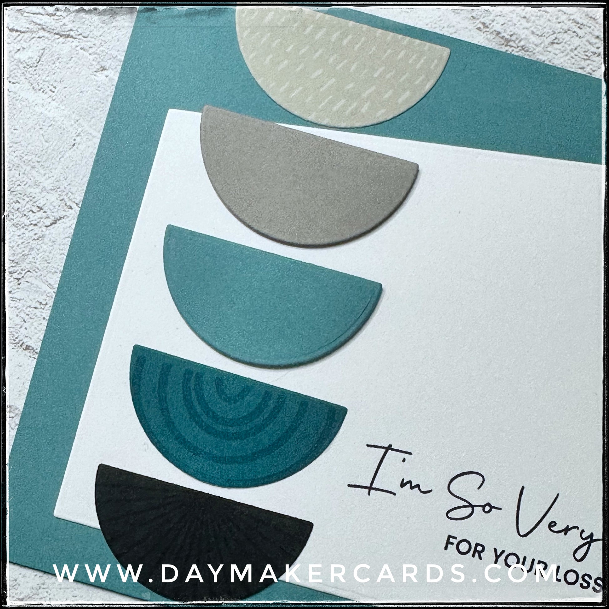Five half-circles have been die-cut and adhered to the left side of this card front. Several of them are elevated with dimensional adhesive while the others feature a tone-on-tone stamped design. The sentiment "I'm So Very Sorry for your loss" has been stamped in black ink.