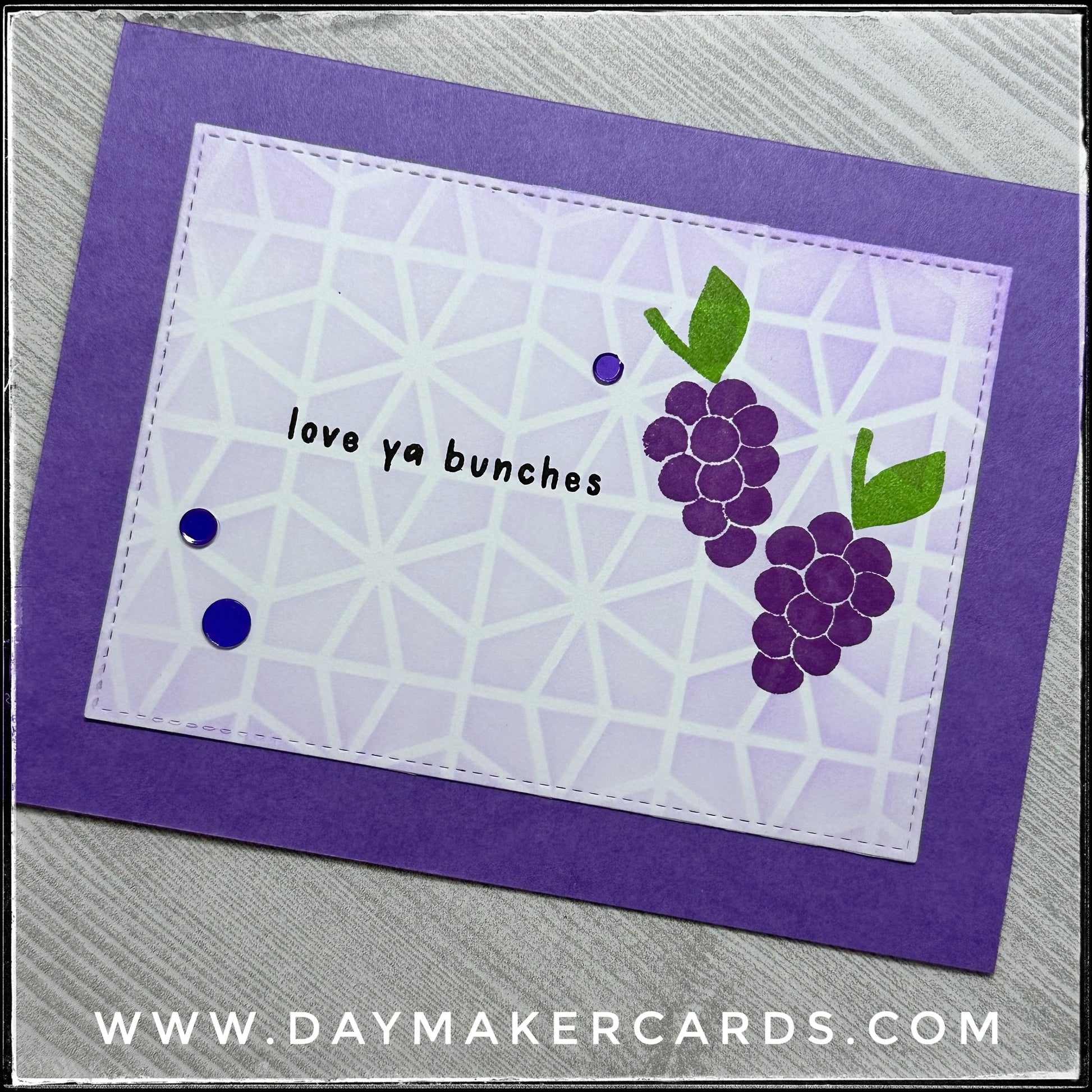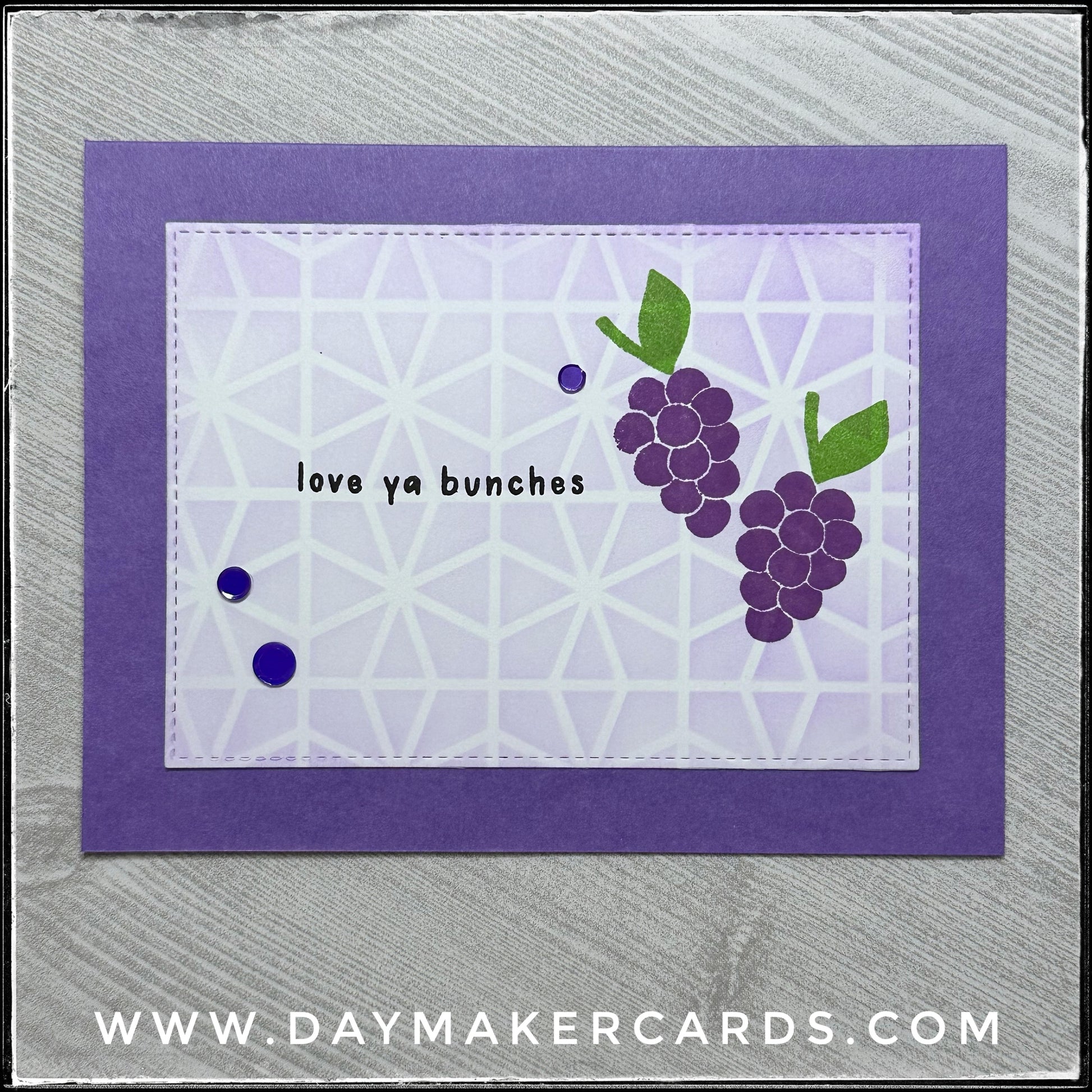 The background of this handmade card is filled with a stenciled + ink blended geometric pattern in a subtle shade of purple on a panel with faux stitched edges. A pair of stamped bunches of grapes accent the sentiment "love ya bunches" which is stamped in black ink. A trio of shiny purple sequins adds some dimensional detail.