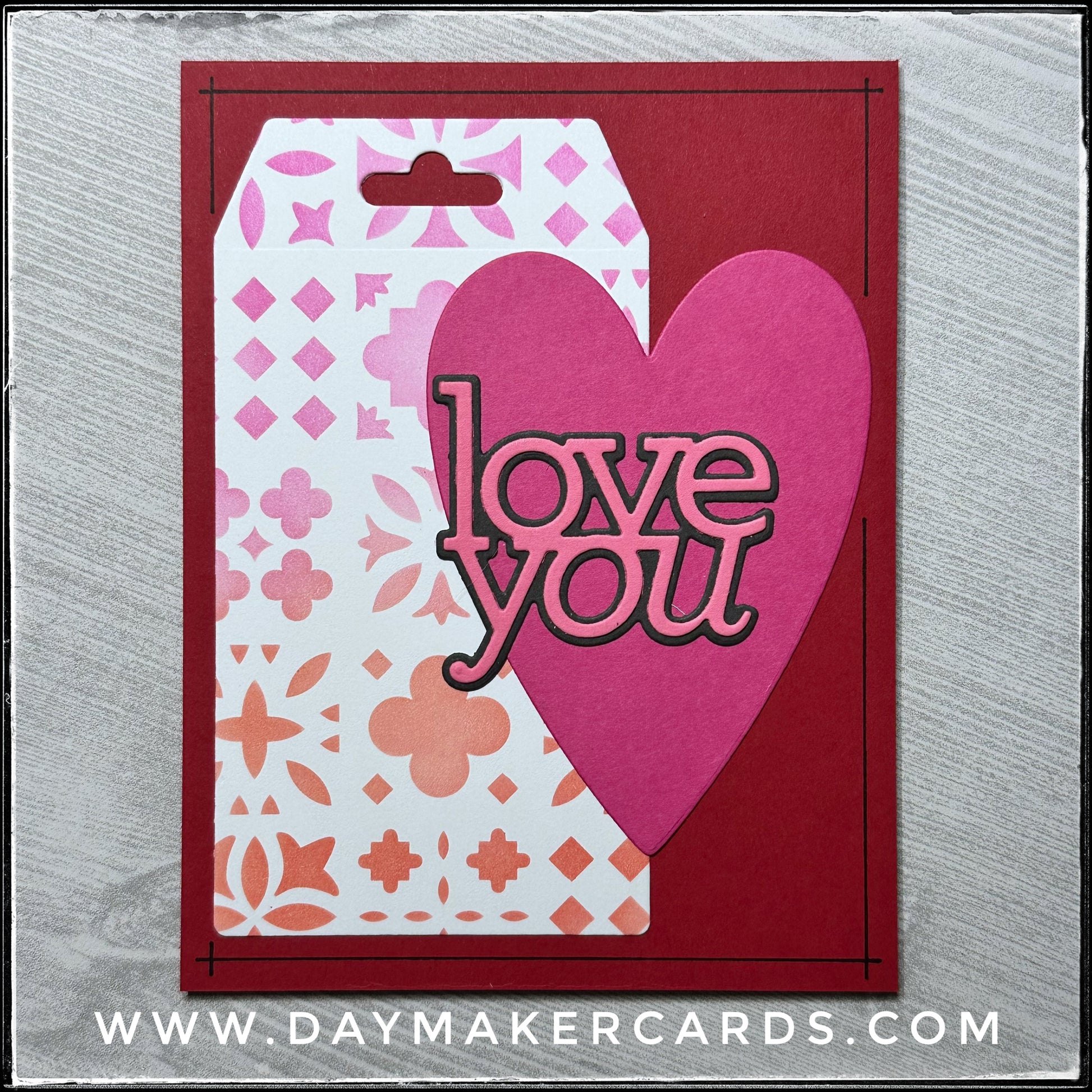 A large, die-cut tag has been stenciled in shades of pink and red in a tile-like pattern behind a die-cut heart and sentiment, "love you". Thin, hand-drawn black lines surround the perimeter of this card.