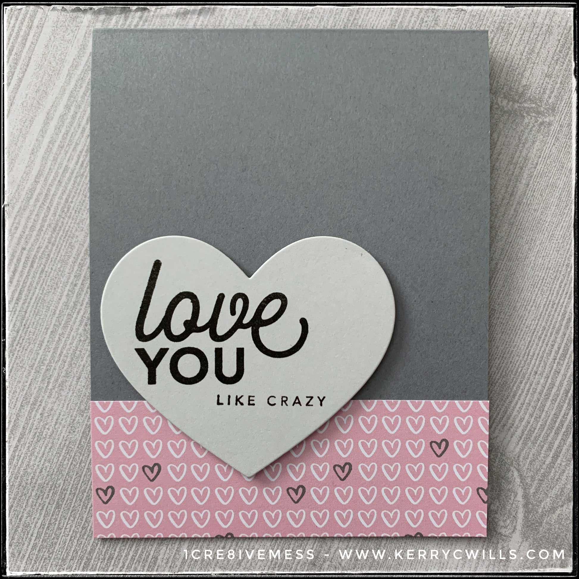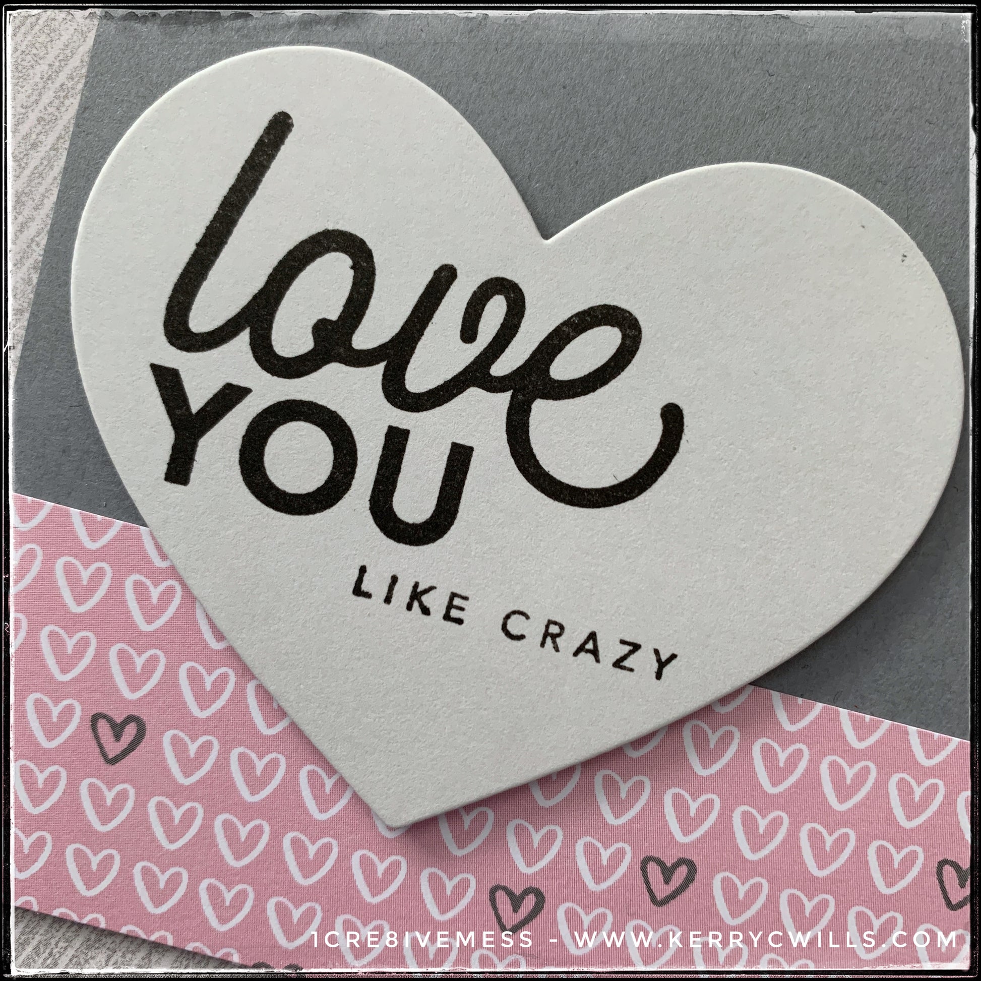 A large die-cut heart is stamped with the sentiment "love you like crazy" in black ink. The heart is elevated off of the card base with foam tape. A panel of patterned paper features a plethora of hearts.