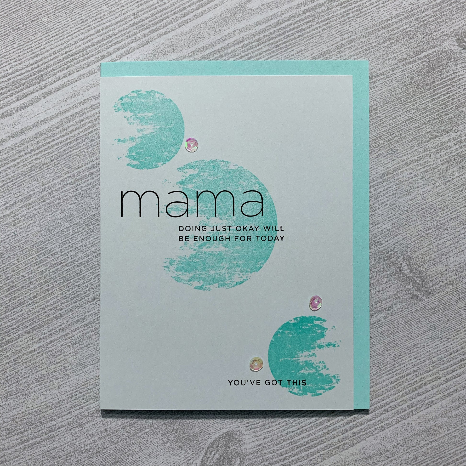 Featuring three aqua circles stamped with a brushstroke texture, this card front features the sentiment "mama - doing just okay will be enough for today --- you've got this" in black ink.