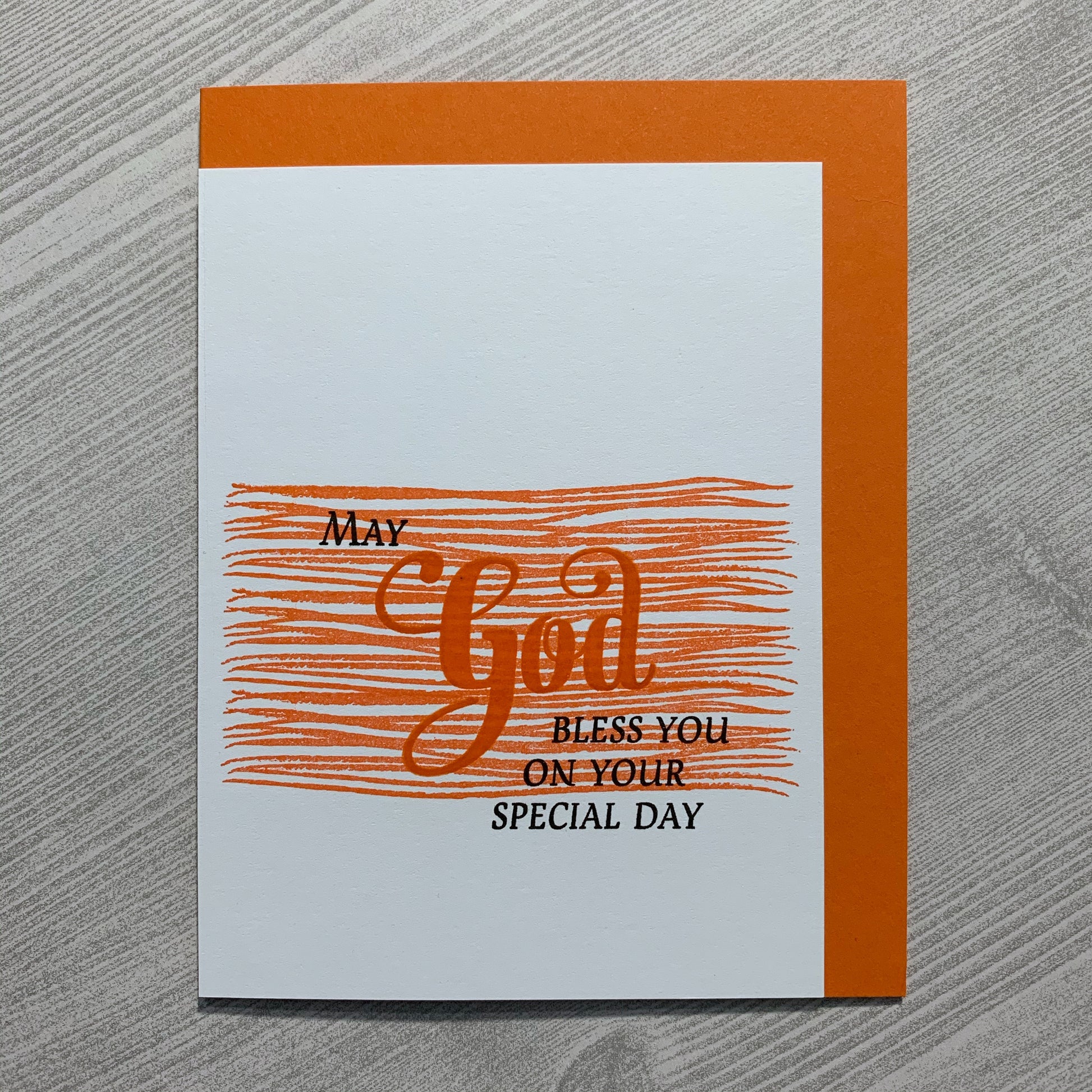 A subtle lined background is stamped in a color that matches the color of the card base, in this case orange. The main word of the sentiment [God] is stamped in the same color and has also been heat embossed so it is shiny and has a slightly raised texture. The sentiment reads "may God bless you on your special day" and is stamped in black ink.
