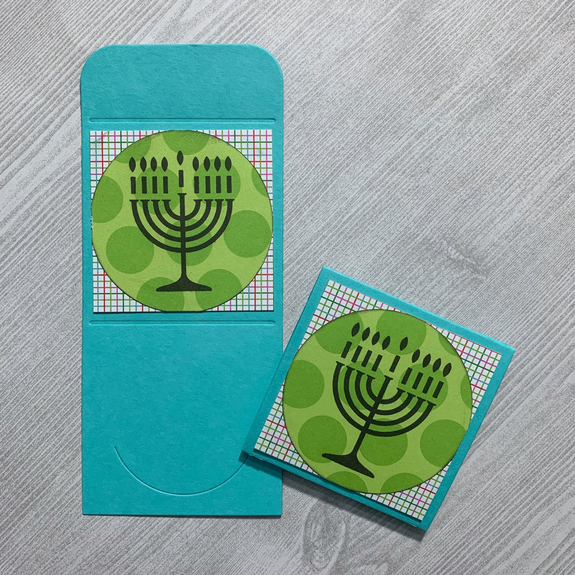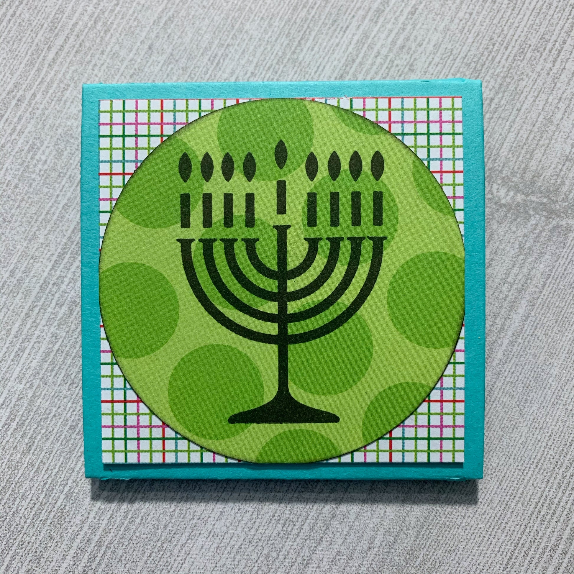 The silhouette of a menorah is stamped in black ink centered on a green tone on tone polka dotted circle. It is mounted on a plaid background.