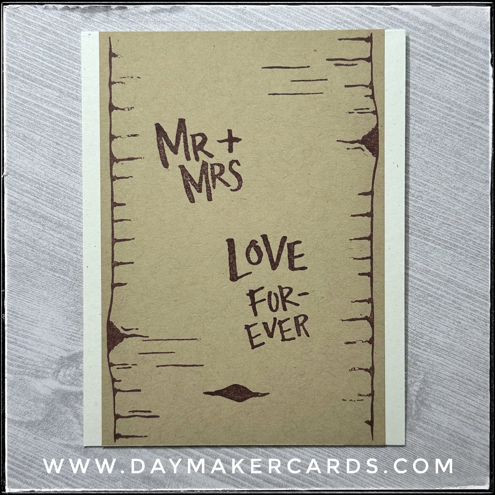A kraft colored center panel features tree-like marks and knots, along with the words "Mr + Mrs" as well as "Love Forever" - all stamped in brown ink.