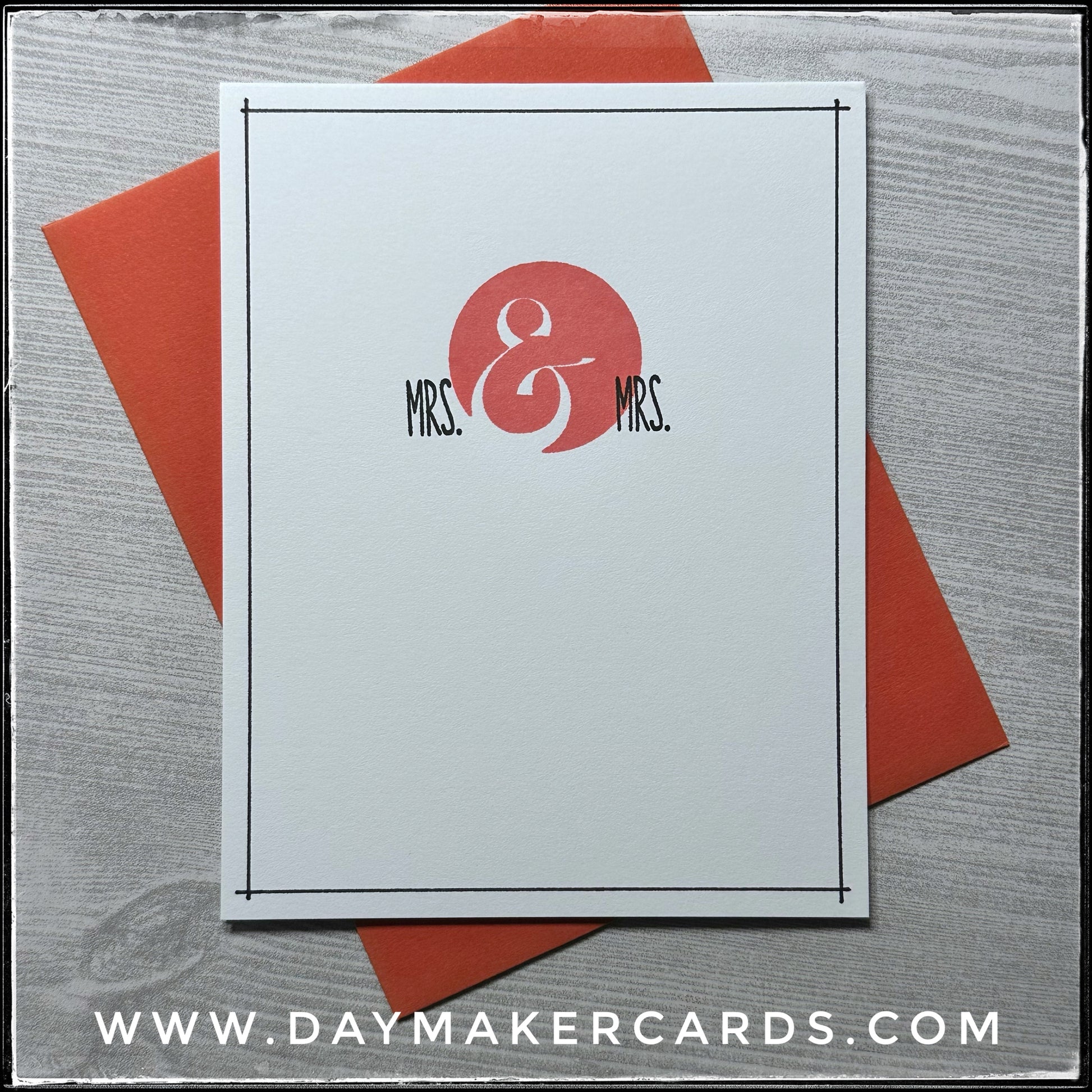 "Mrs." is stamped twice in black ink on either side of an oversized ampersand which is stamped in red-orange. A simple design but also clean and classic with thin black lines surrounding the perimeter of the card front.