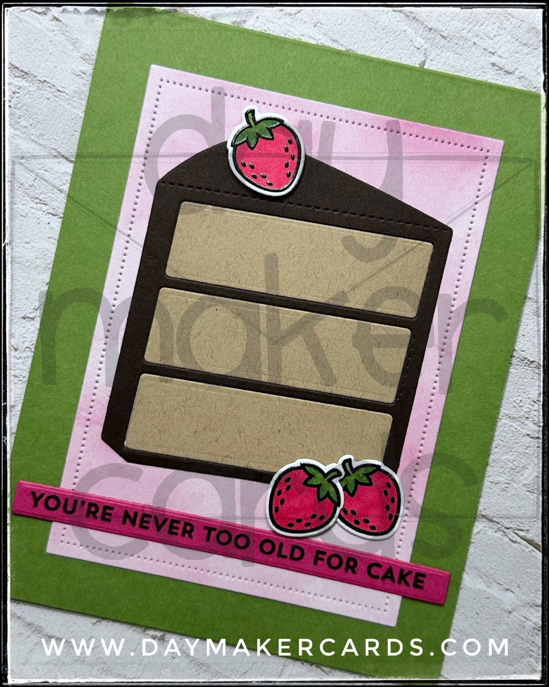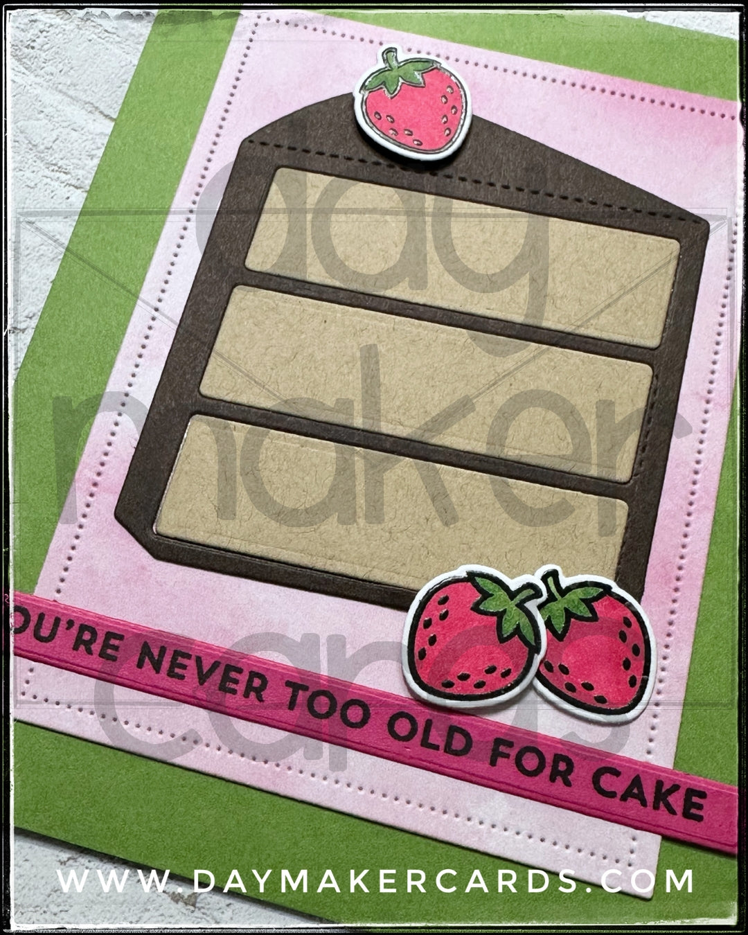 This handmade card is filled with celebratory elements including a HUGE piece of layered cake accented by a trio of die-cut and colored strawberries. Two of the strawberries are elevated off of the card base with dimensional adhesive. The sentiment is stamped in black ink on a narrow pink strip and reads "you're never too old for cake".