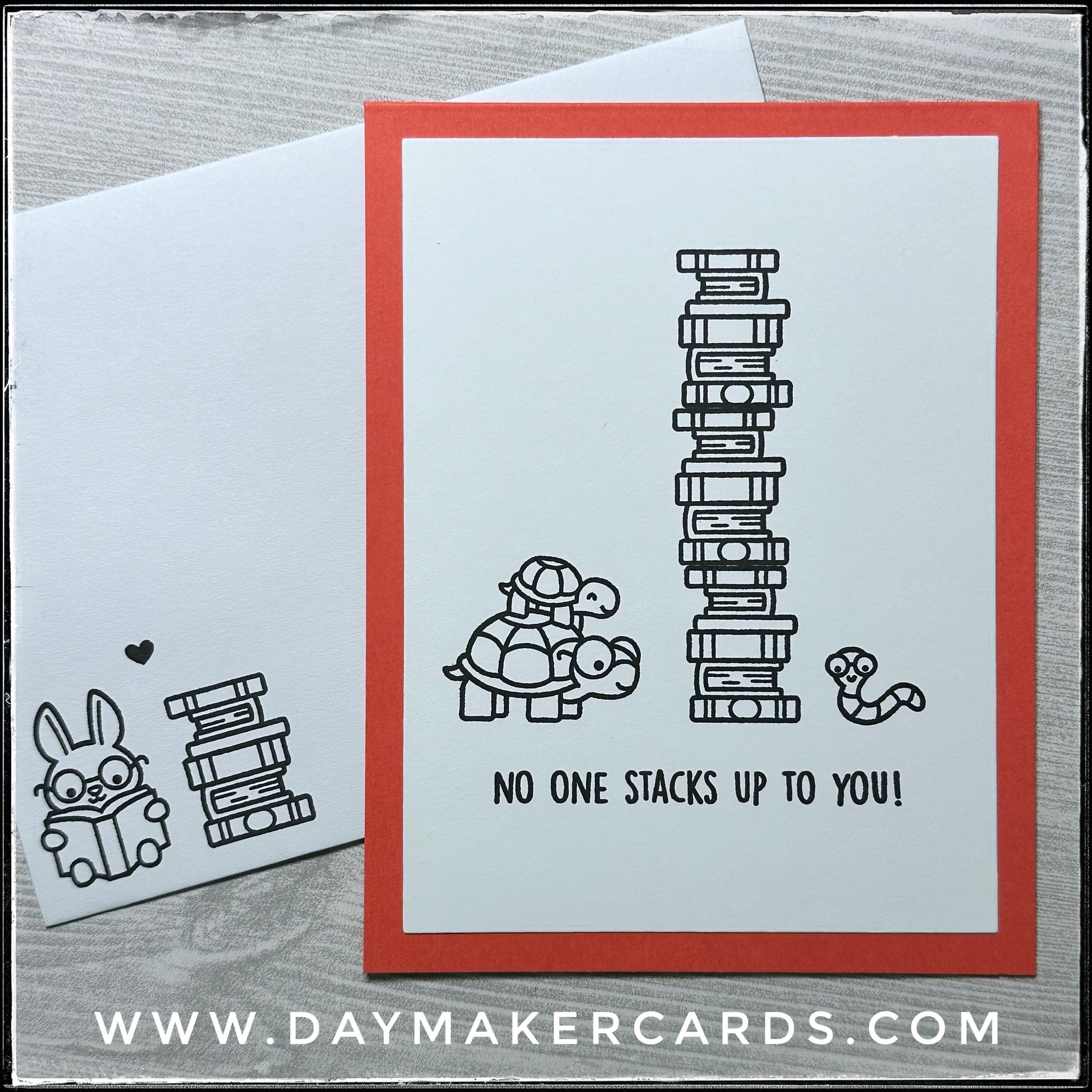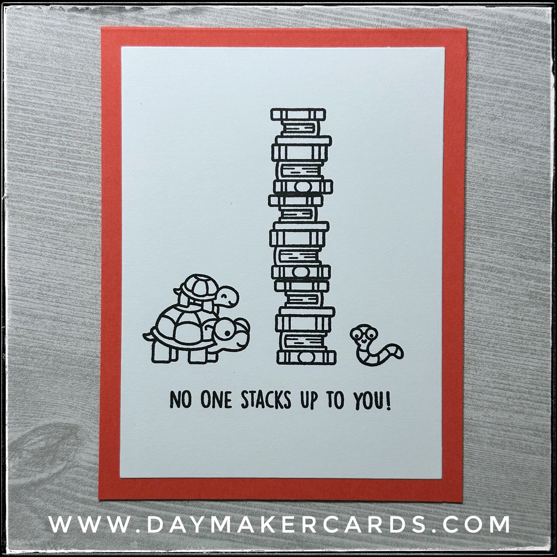 A super tall stack of books sits between the cutest little worm and his turtle friends on this handmade card. The sentiment "No One Stacks Up To You" is stamped in black ink beneath the images. All the details are stamped on a white card panel, made of heavy cardstock. Book lovers are sure to get a kick out of this card!