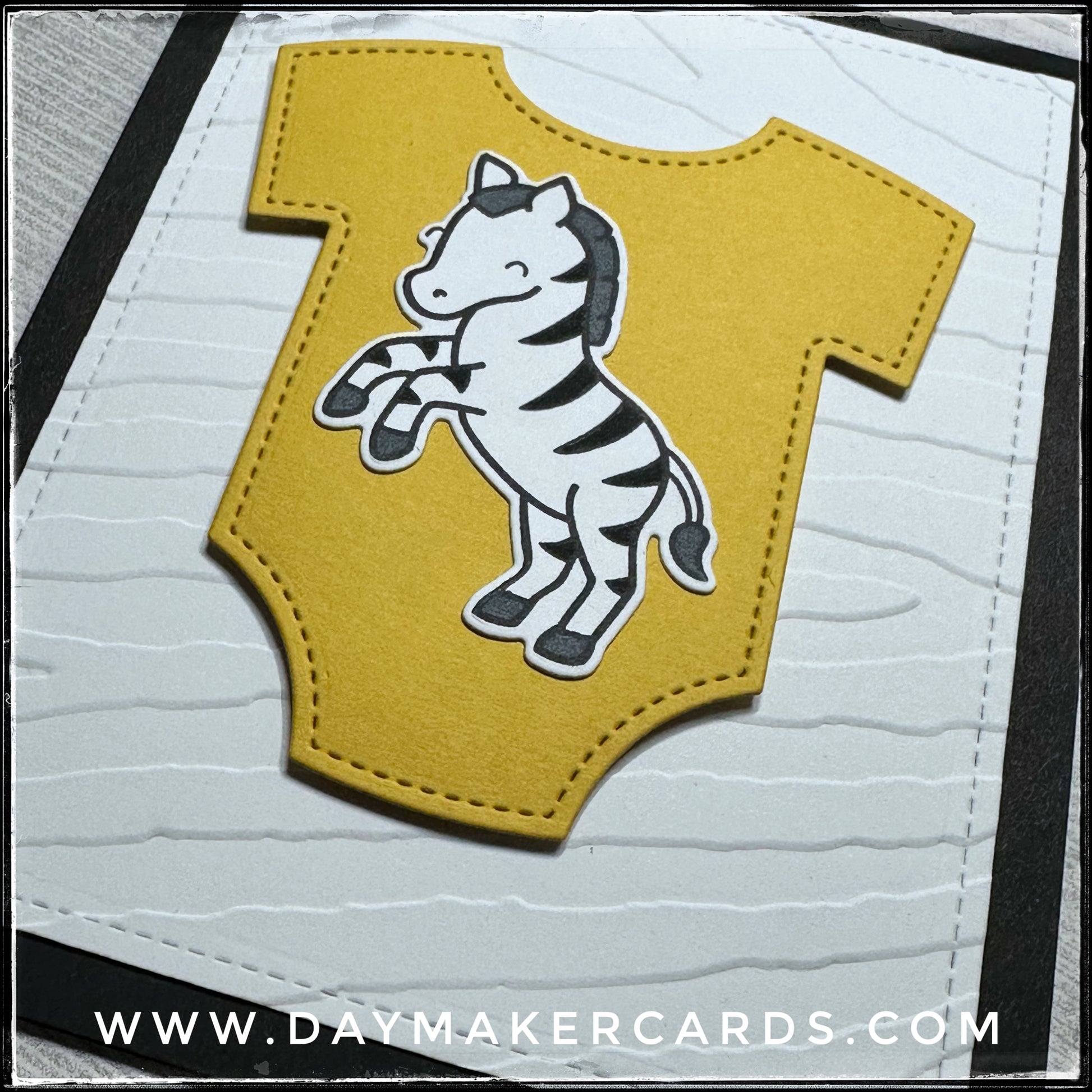 A zebra embossed texture on the background of the front panel coordinates with the stamped, colored and die-cut zebra image that's front and center on a die-cut onesie. The onesie is elevated off of the card base with dimensional adhesive. On the inside of the card, a coordinating white panel features the sentiments "Oh baby!" and "Congratulations" both stamped in black ink. Plenty of room is left for your personal message, regardless if you're using this card for a pregnancy announcement, baby shower or when the tiny human actually arrives!