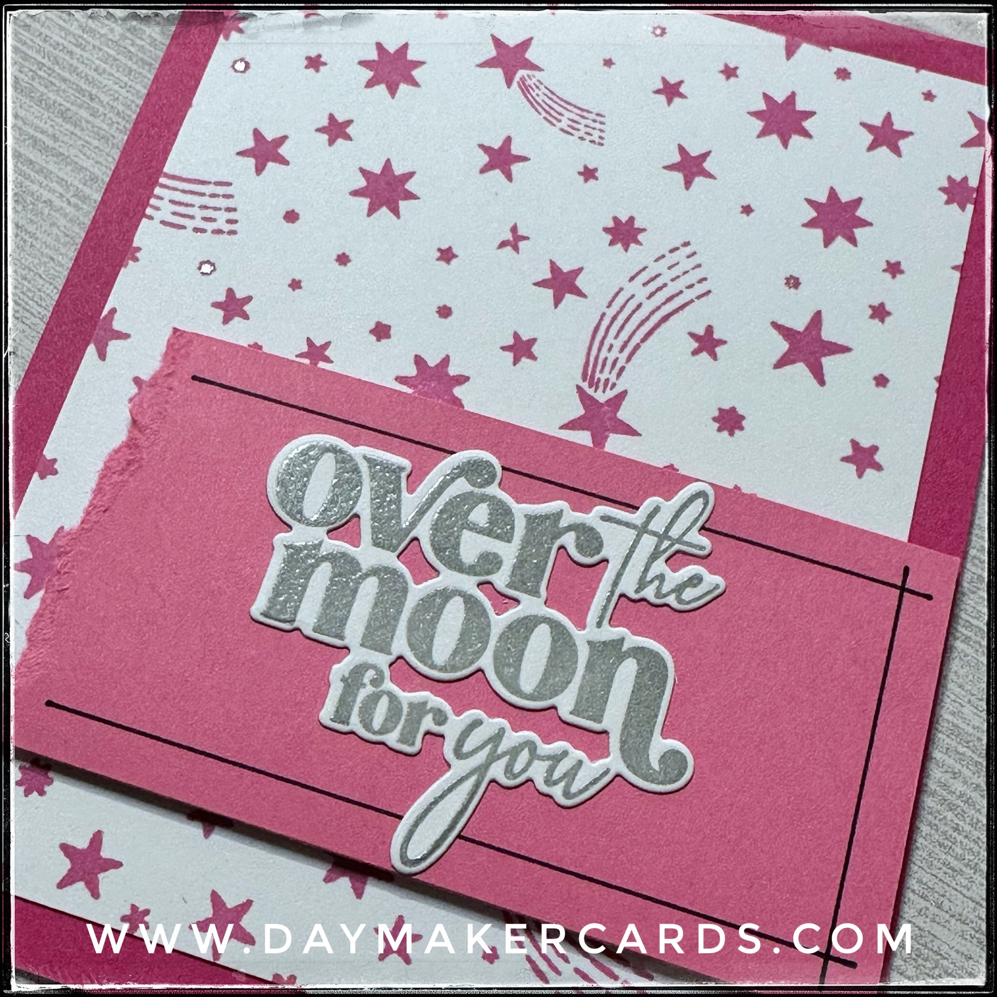 Utilizing slightly unconventional colors, the background on this card is full of pink shooting stars. Several have been accented by a sparkle finish. Elevated off of the card base is a block of light pink cardstock with a purposely torn edge and features the sentiment which has been stamped, embossed and die-cut and reads "over the moon for you" in silver. Black hand-drawn lines surround the perimeter of the decorative block.