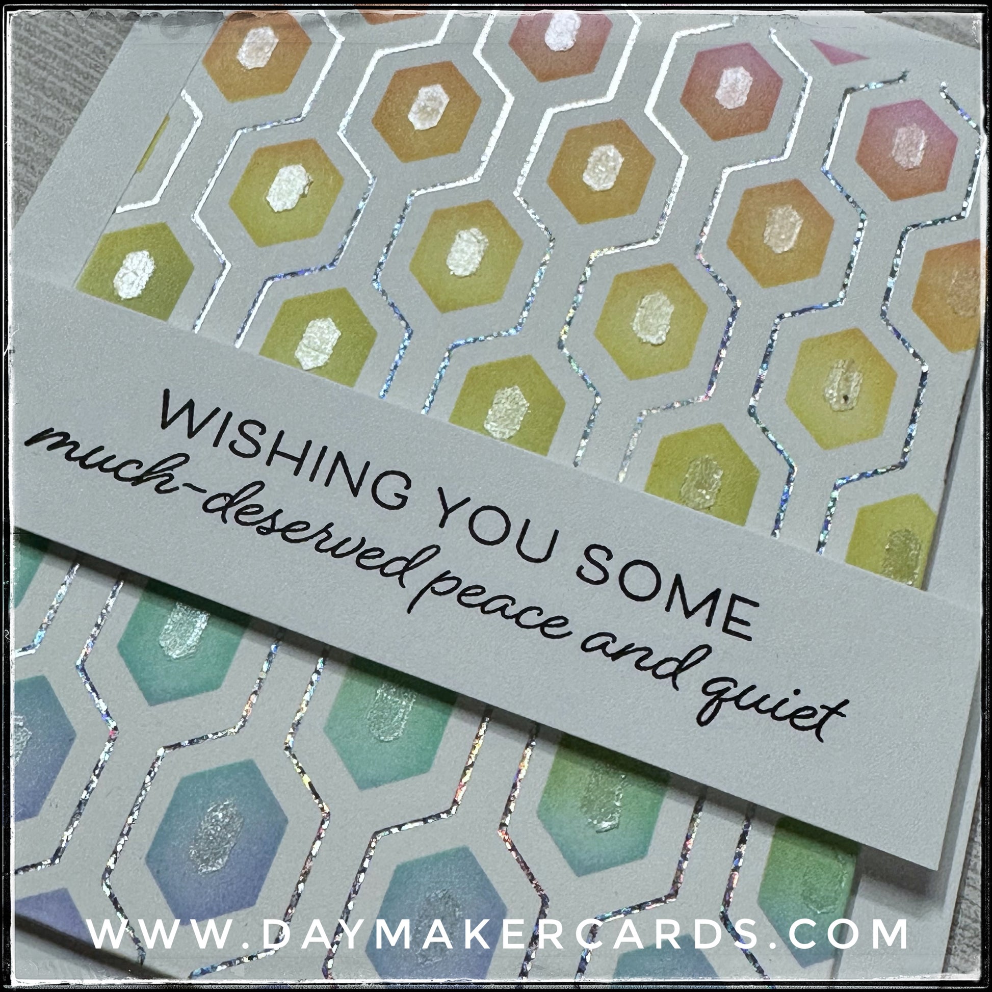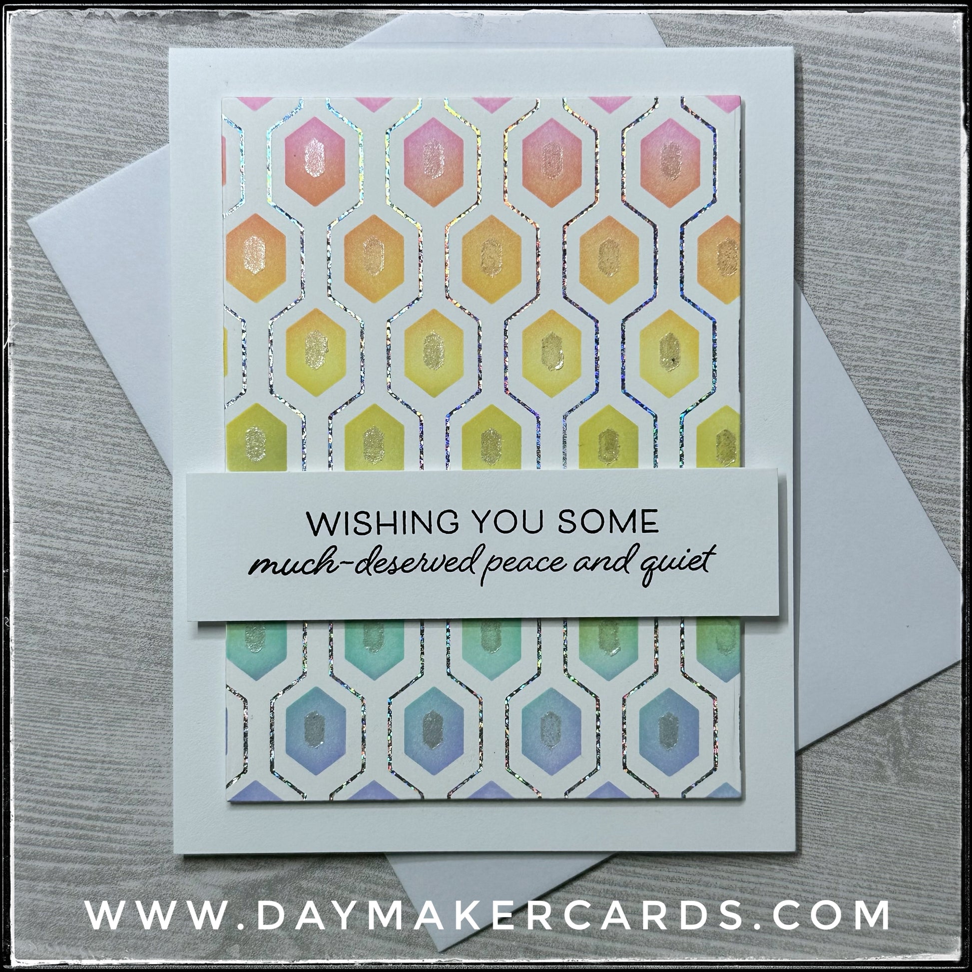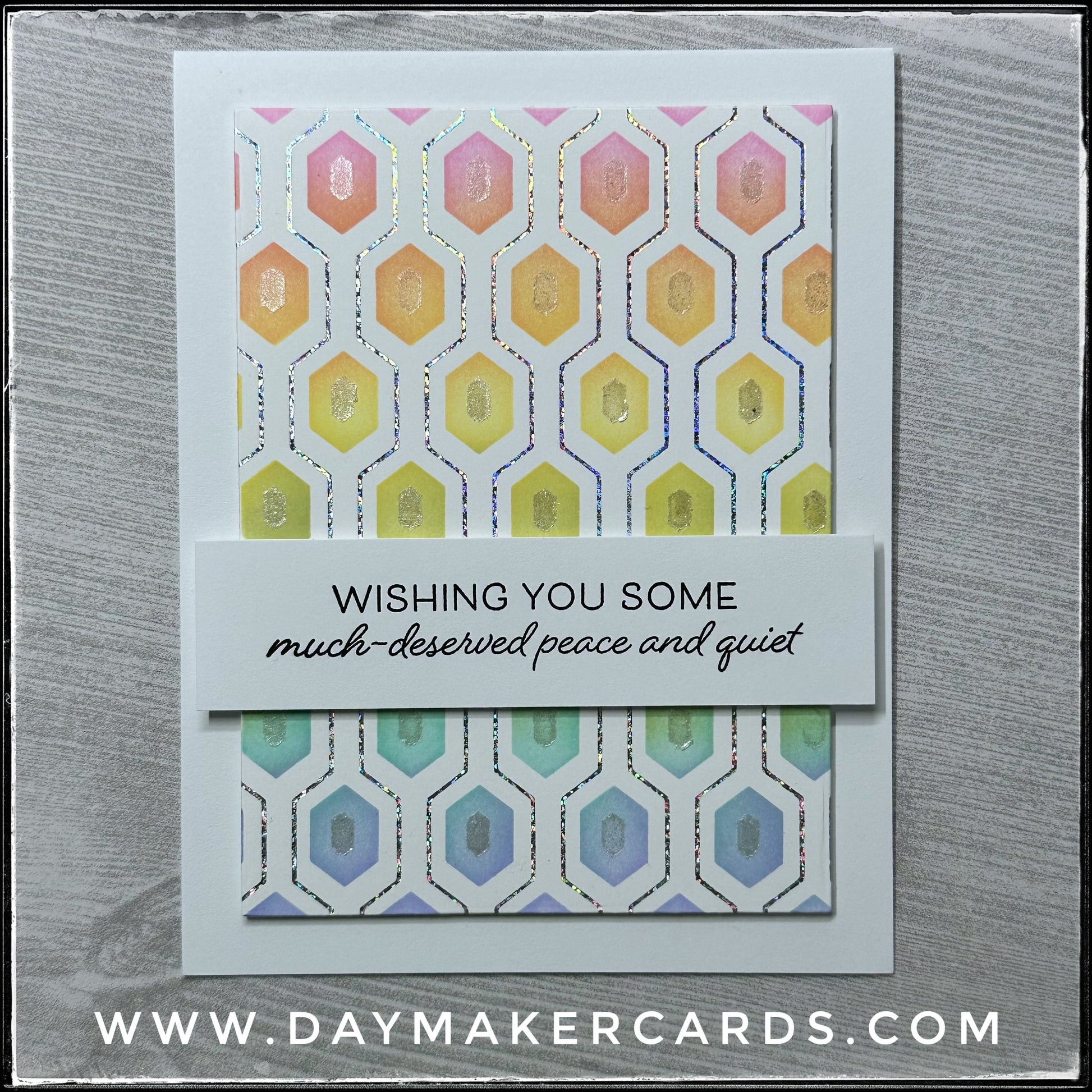 A unique design shines in an iridescent reflective foil and the inner areas have been ink blended in a rainbow color scheme and highlighted with a slightly raised iridescent texture paste. A separate block has been elevated off of the card base and features the sentiment, "Wishing you some much-deserved peace and quiet" which is stamped in black ink.