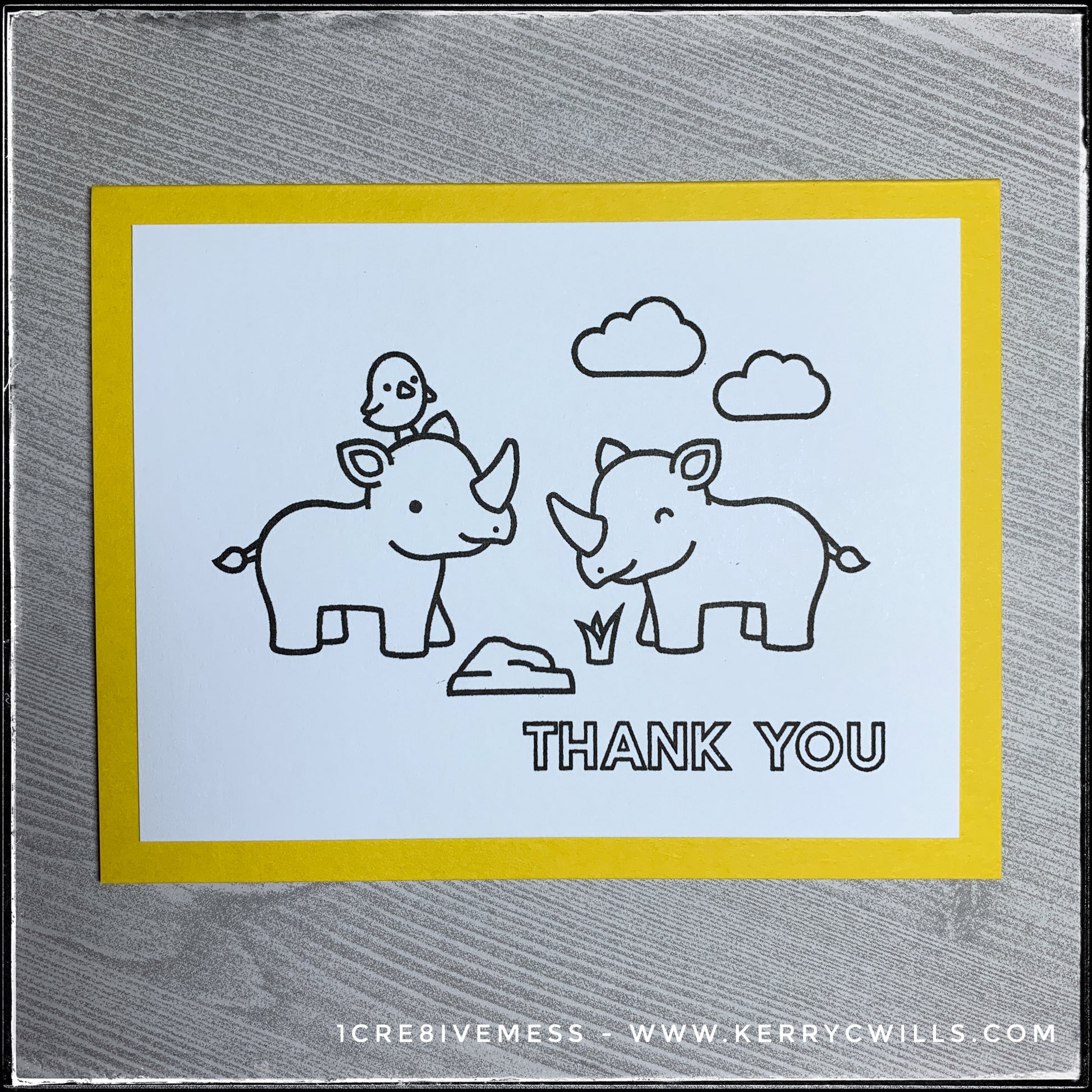 Two rhinos hanging out with a bird friend among some rocks and grass are stamped on a white card panel, made of heavy cardstock. The sentiment "Thank You" is below in block letters.
