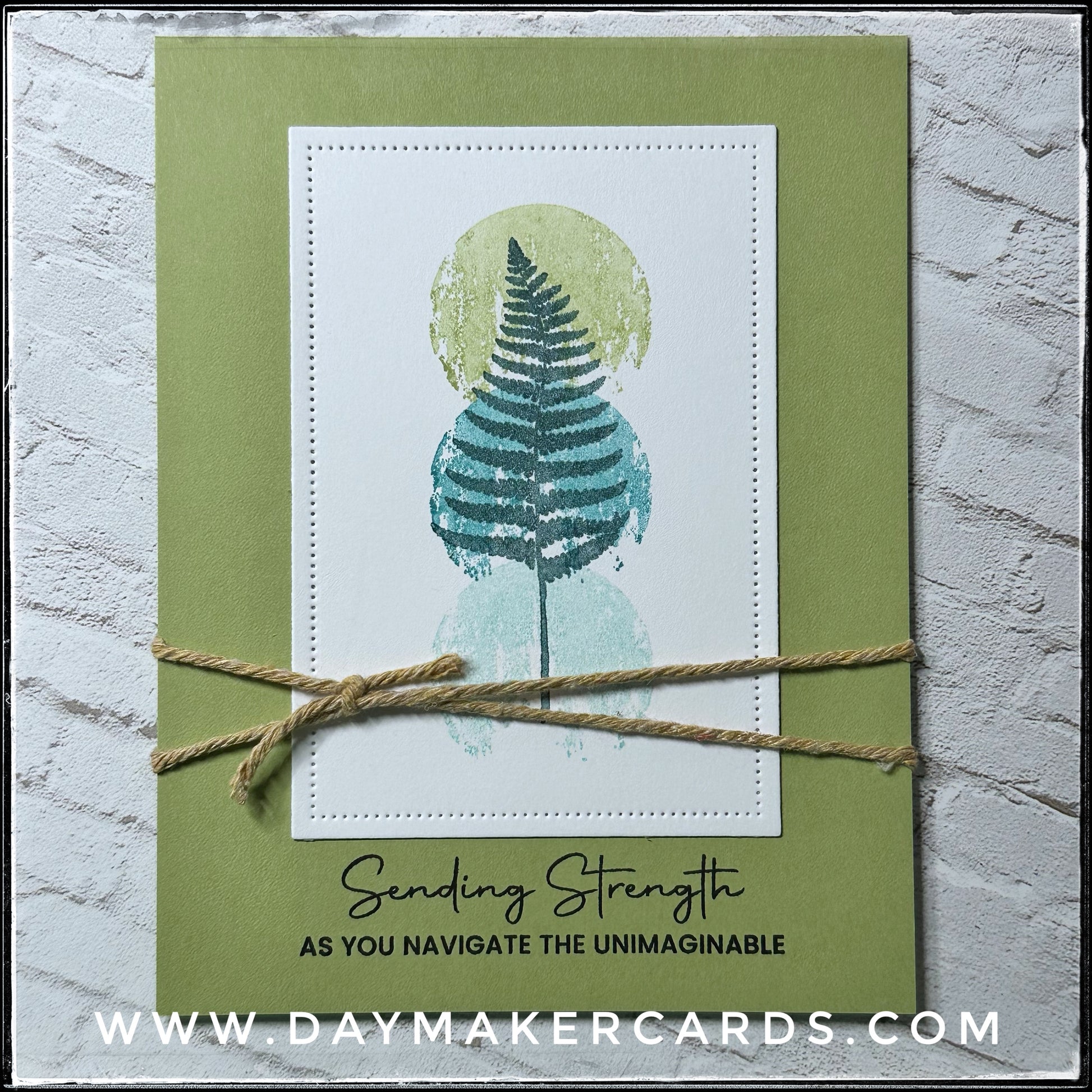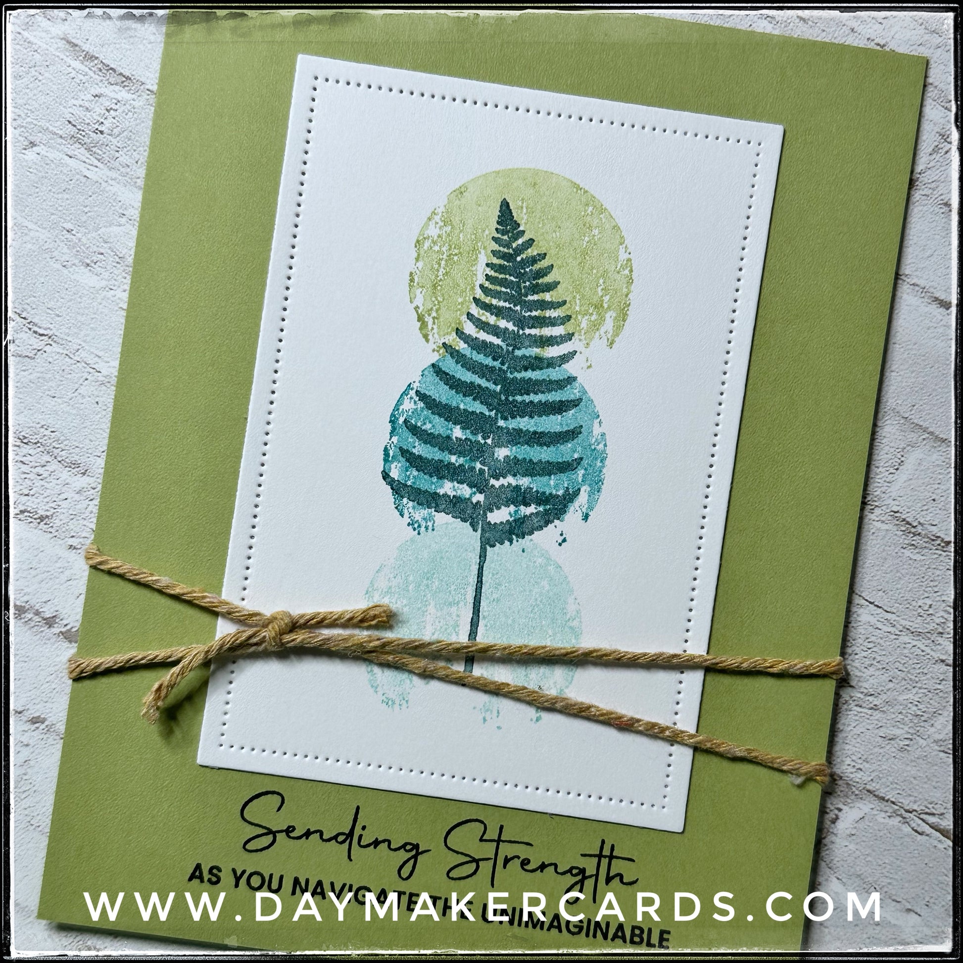 A die-cut panel with small pierced holes fills the center of the card front. Stamped along the background are a trio of watercolor-inspired circles beneath the image of a fern. Cool green and blue tones provide a calming, caring vibe. Natural twine wraps around the entire card front and is visible when the card is open. The sentiment "Sending Strength as you navigate the unimaginable" is stamped in black ink near the bottom of the card front.
