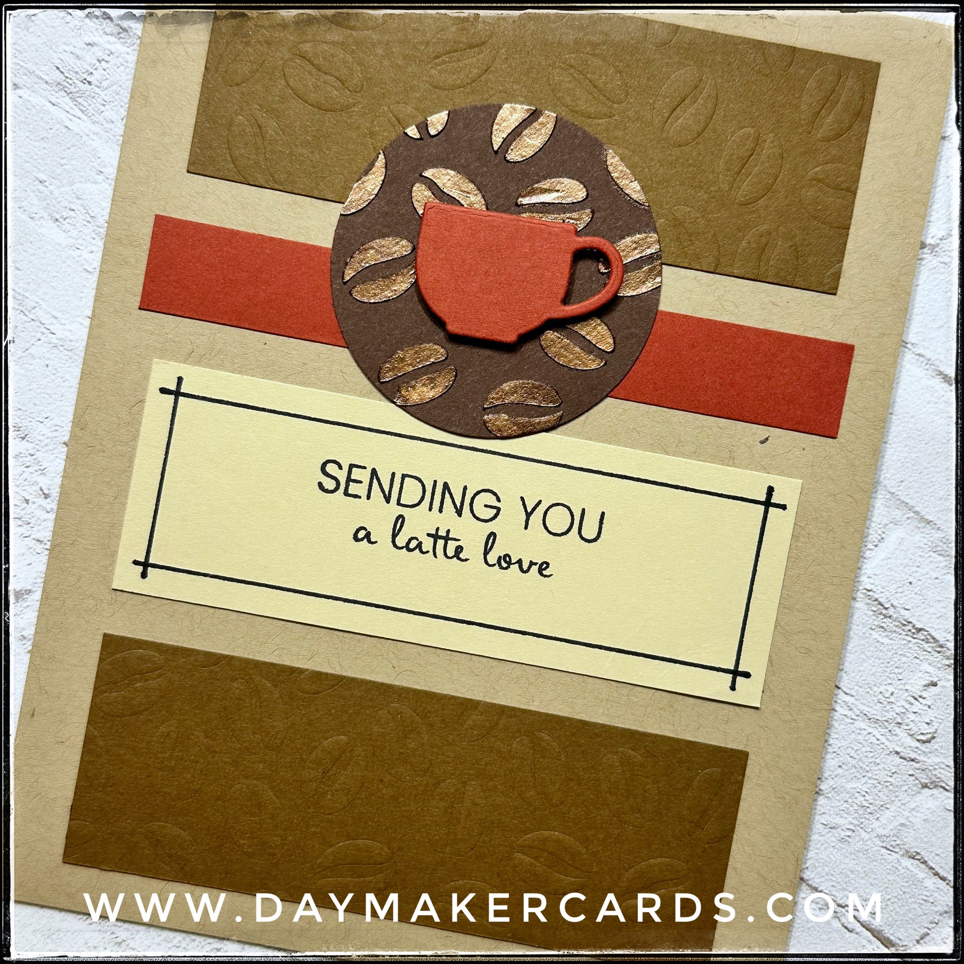 Two panels feature embossed images of coffee beans and a third panel hosts the sentiment "sending you a latte love" which is stamped in black ink. Thin, hand-drawn black lines surround the edges of the panel with the sentiment. A die-cut circle has dimensional coffee beans in a shimmery brown texture paste and holds a small die-cut coffee mug.