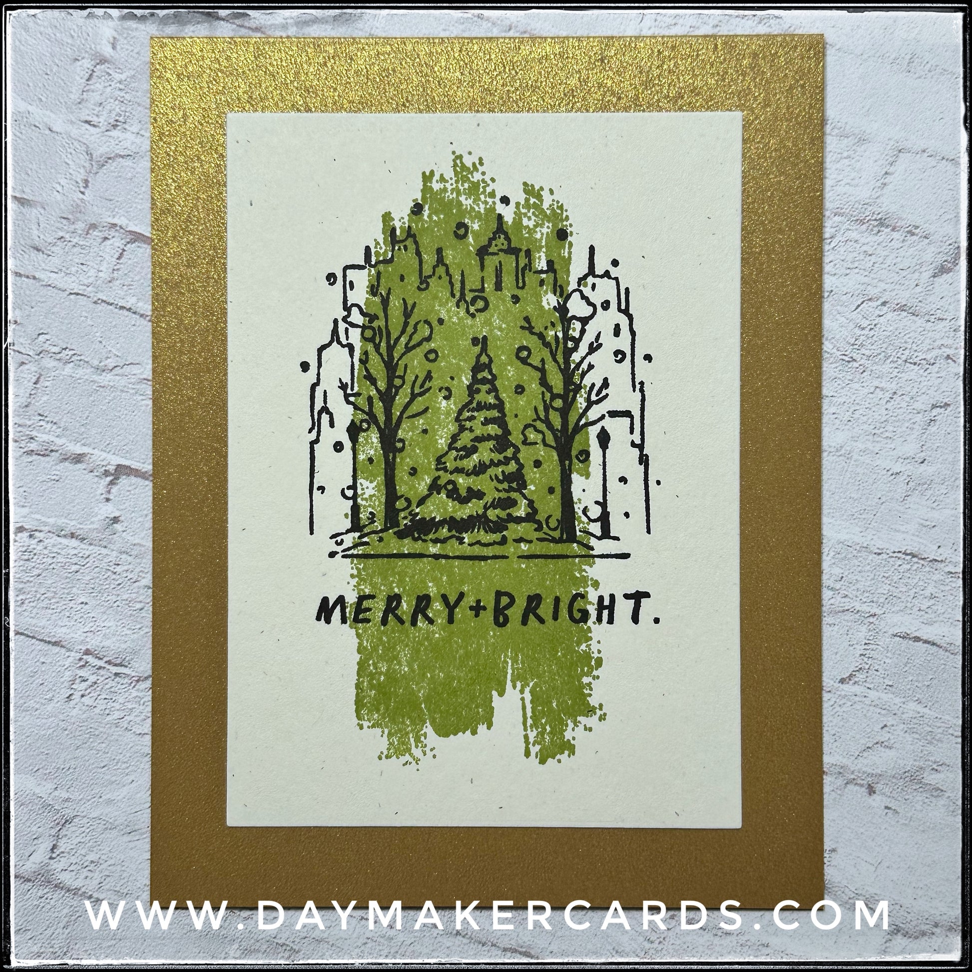 - a city skyline of buildings surrounding a large tree, "merry + bright" and avocado green