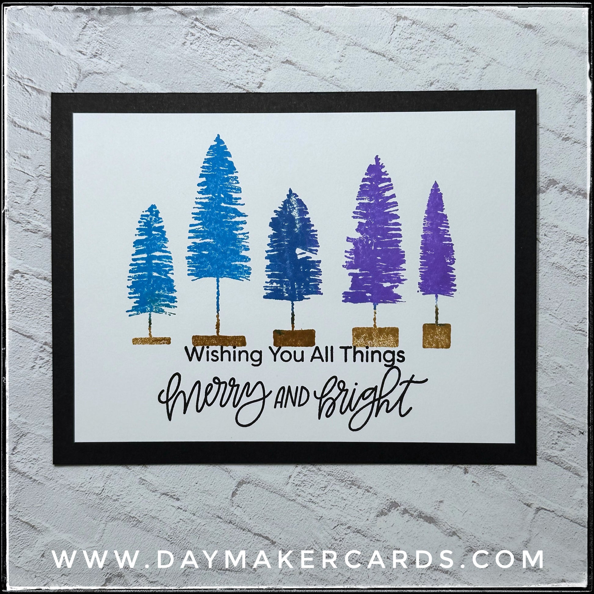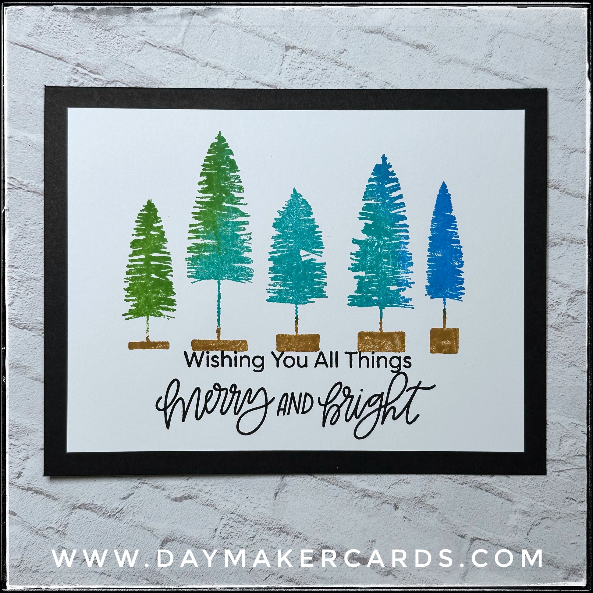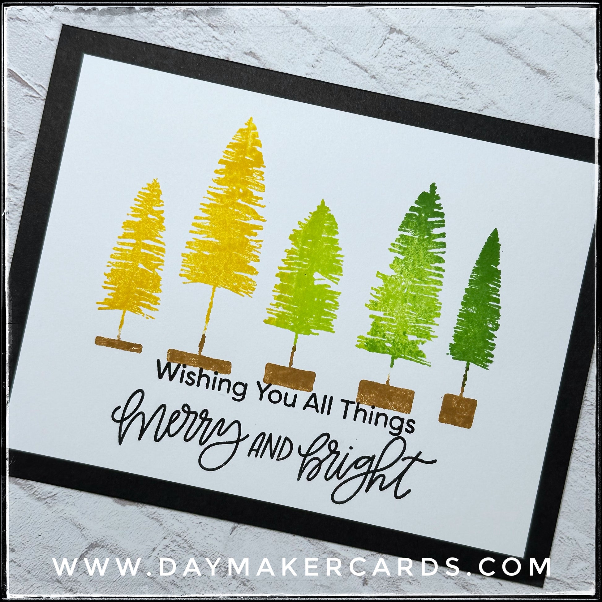 Featuring a row of five rainbow ombre bottle brush trees, each card front is stamped with the sentiment "wishing you all things merry and bright" in black ink. Cards include trees in the following color schemes:
