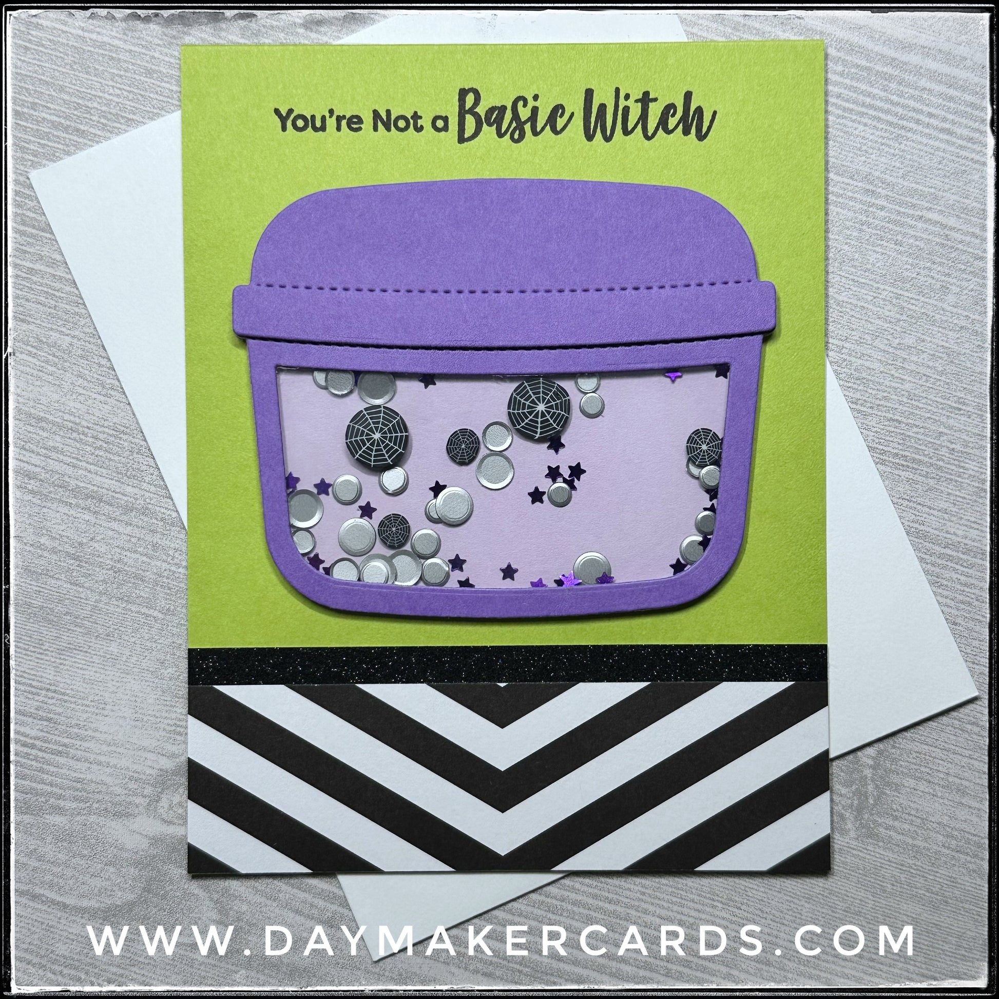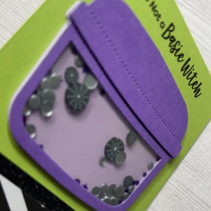 Like the ghost, pumpkin and monster varieties, this design is centered around the iconic shape of a classic McDonald's happy meal container. It's a shaker card so the contents of tiny stars, sequins and spiderwebs shake back and forth but are self contained so they won't come loose. The lid is elevated for extra dimension. The sentiment, "you're not a basic witch" is stamped in black ink near the top of the card. At the bottom, a block of black and white striped patterned paper is accented by a thin strip of subtle black glitter cardstock.