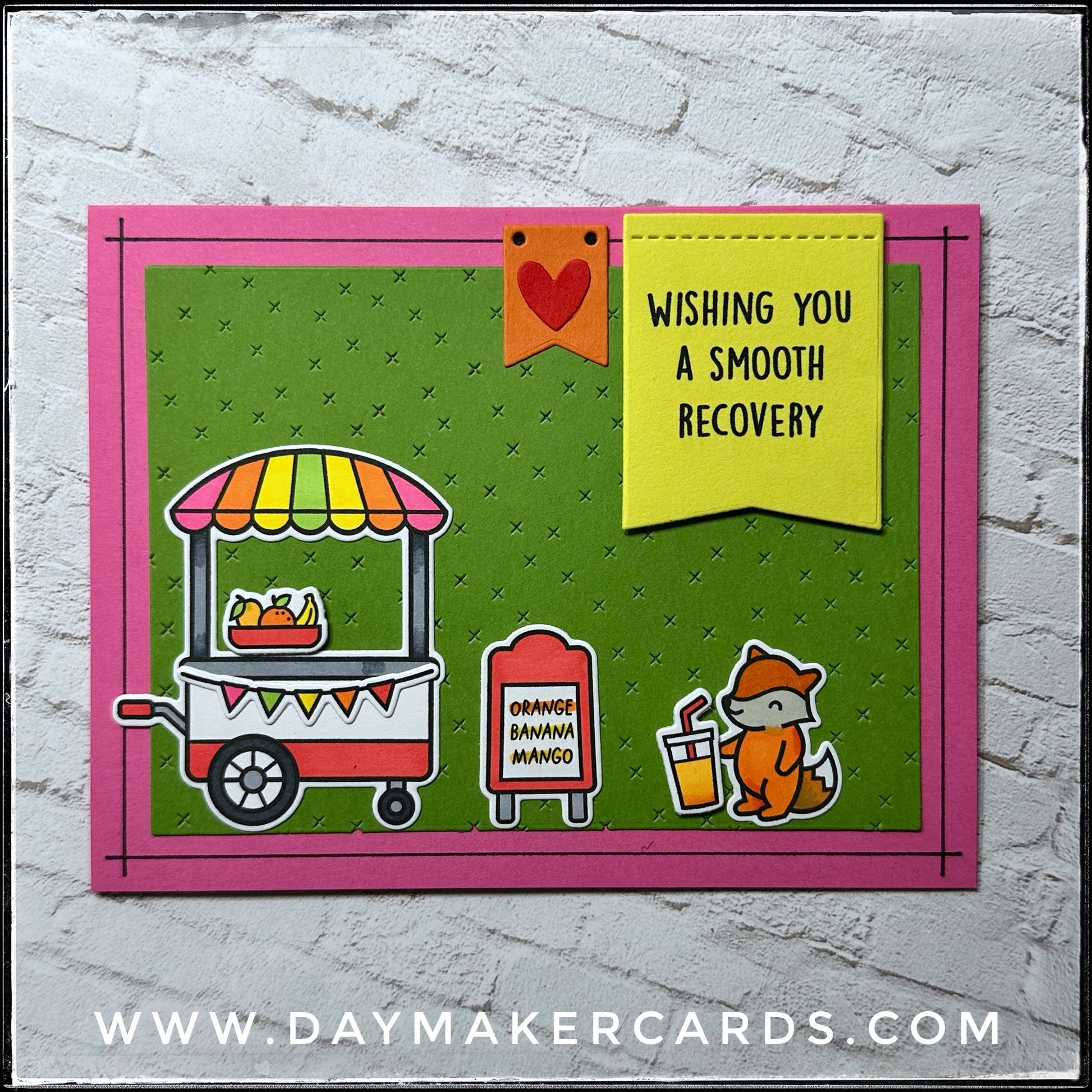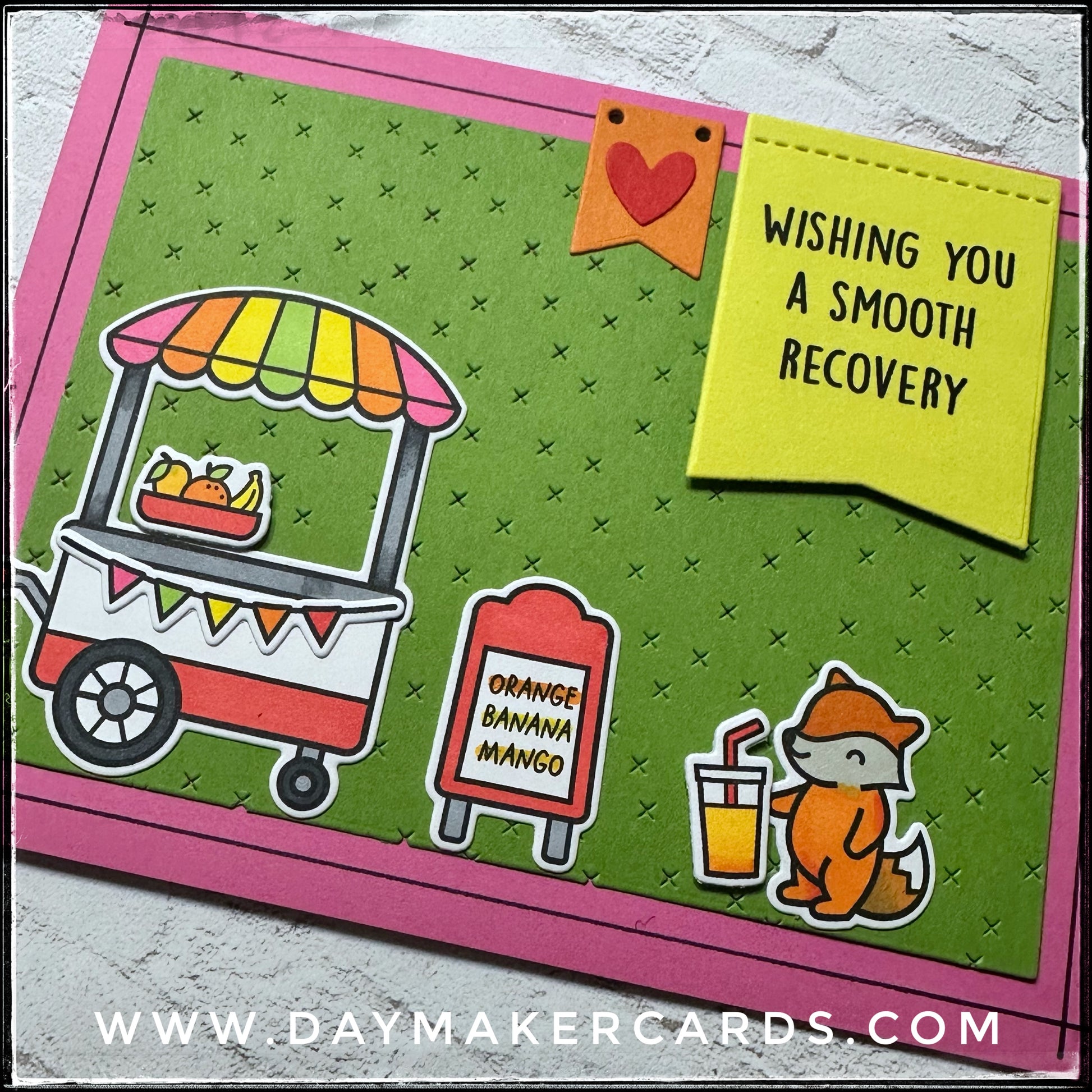 A large yellow flag banner is elevated off of the textured background and is stamped with the sentiment "wishing you a smooth recovery" in black ink. Below, the scene is set with an adorable little fox drinking a smoothie from the cart full of fresh fruits. Several additional items, including the drink and the fruit are also elevated with dimension.