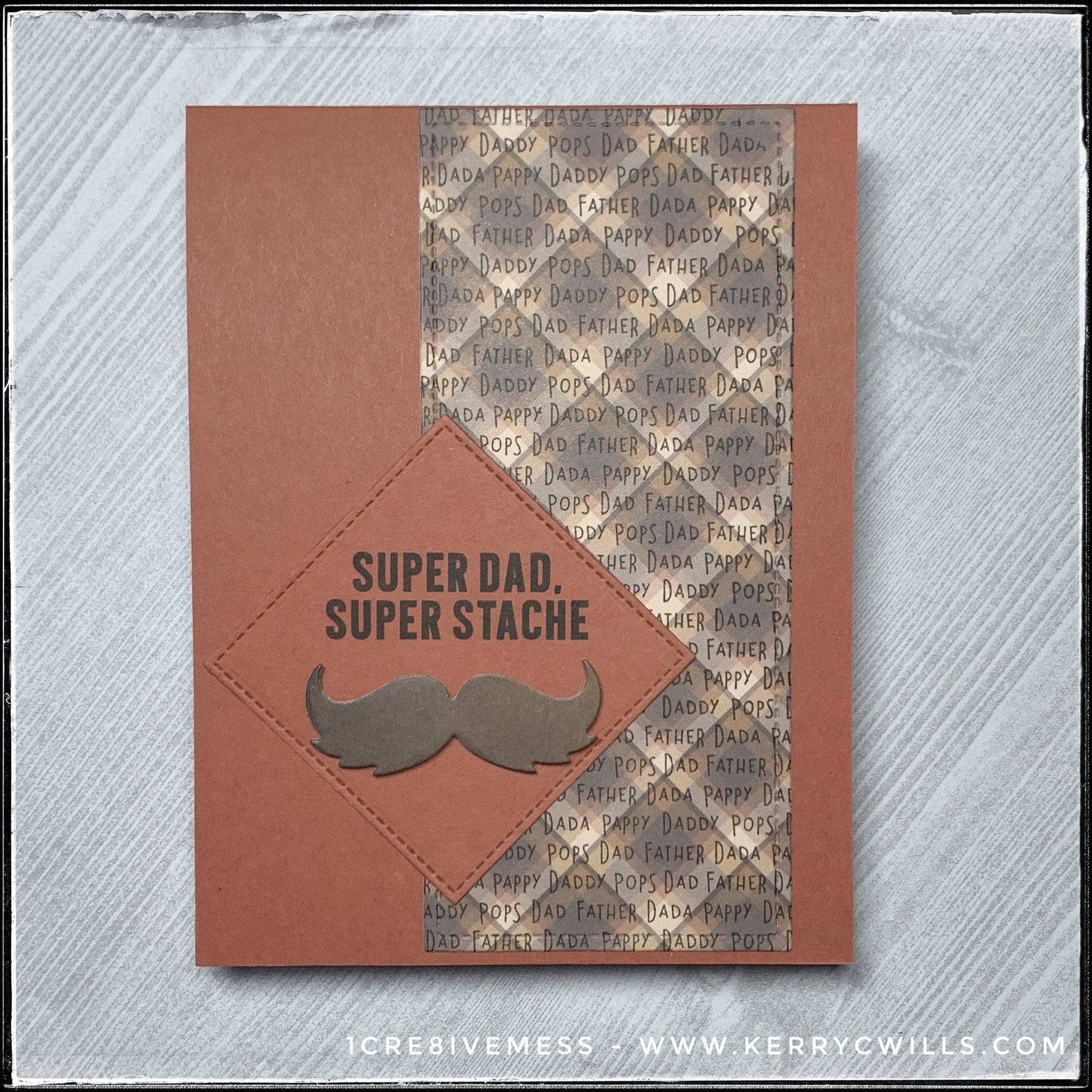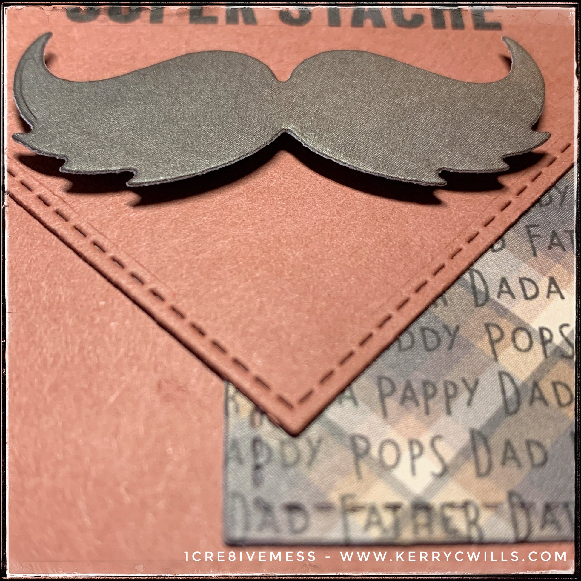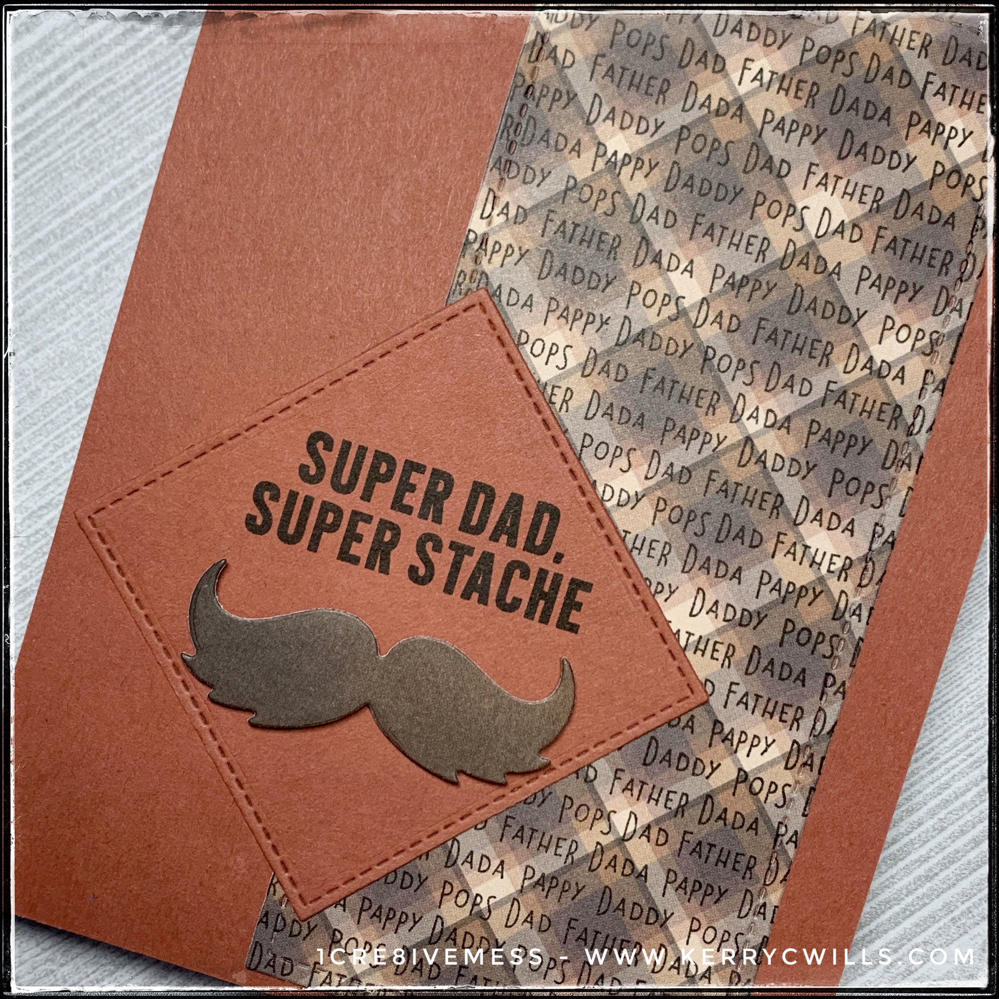 A plaid background has also been stamped with a repeating pattern of the words Dad, Daddy, Pops, Pappy, Father, Dada while a square diamond has been die-cut and stamped with the sentiment, "Super Dad Super Stache" along with an elevated die-cut mustache. Faux stitching adds additional detail.