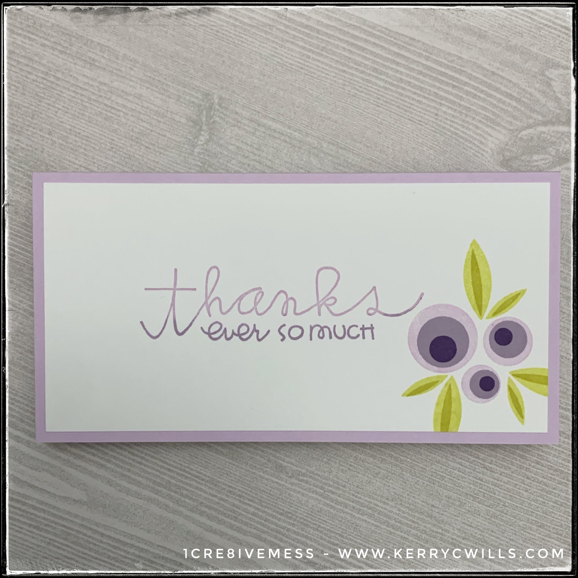 "thanks ever so much" is stamped in an ombre color scheme in shades of lavender & purple. In the lower right corner is a trio is poppy flowers in a coordinating color scheme.