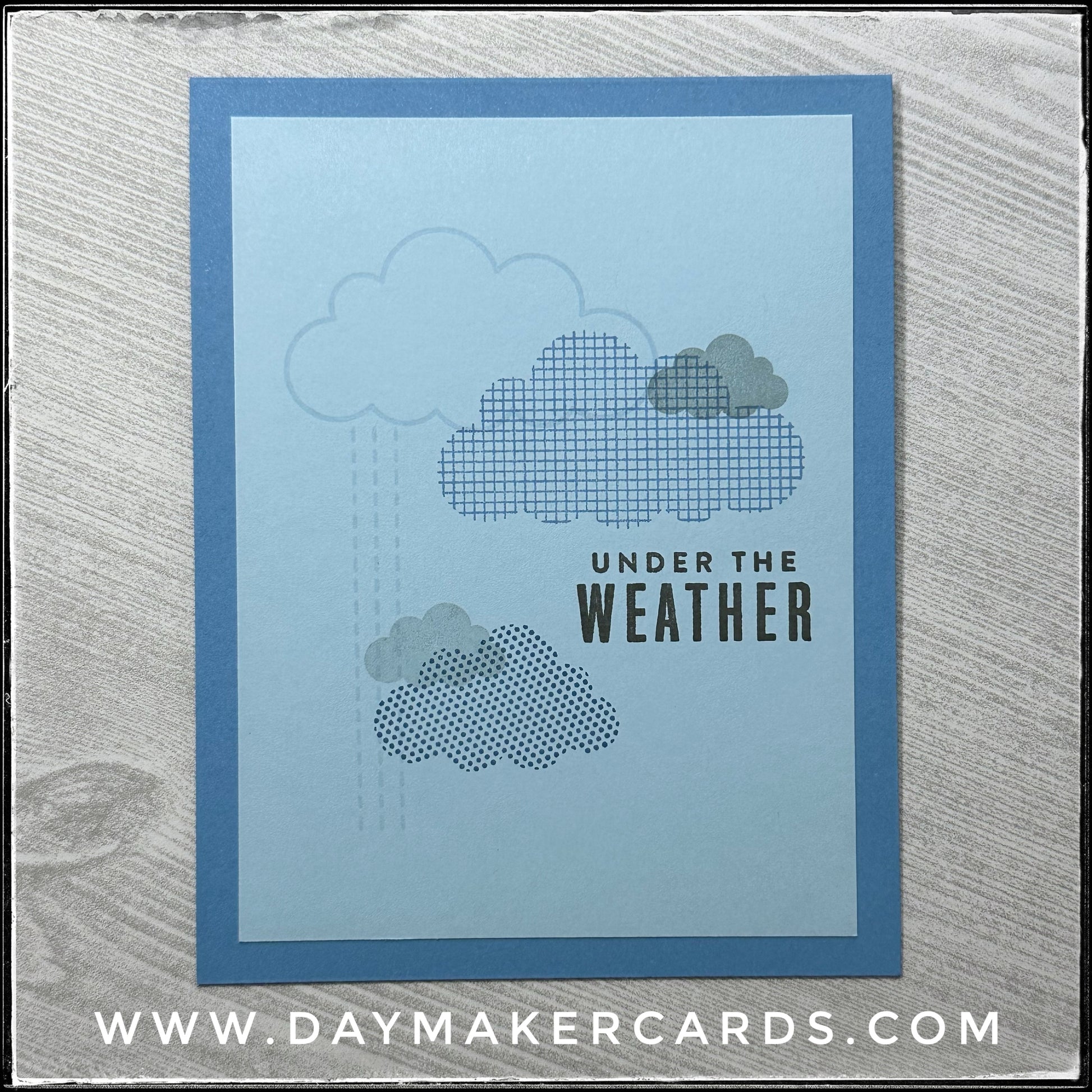 A light blue background is the perfect color for this scene full of clouds in a variety of patterns and shades of blue + grey. Even some subtle raindrops are falling near the sentiment, "under the weather" which is stamped in grey.