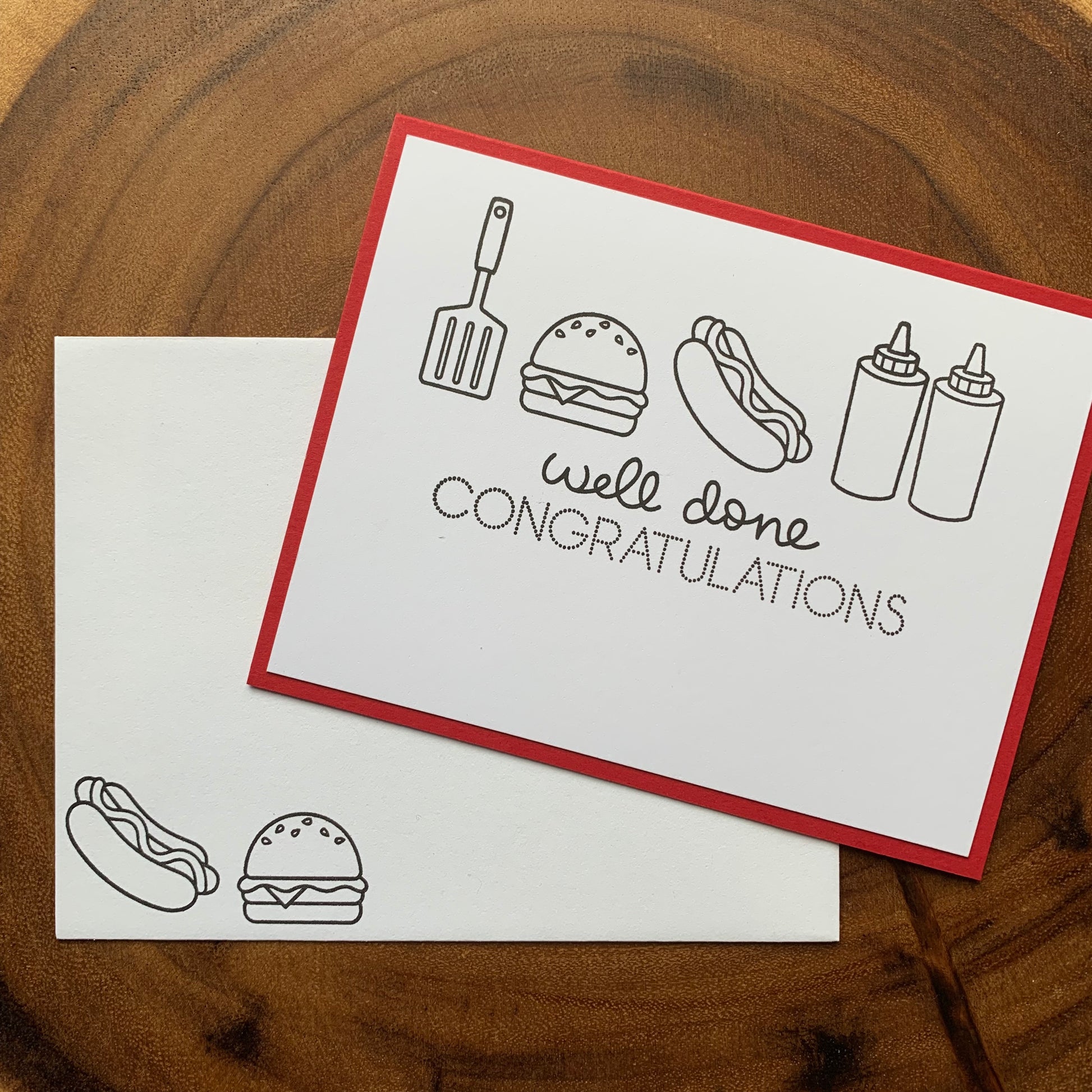 Condiment bottles, a burger, a hot dog and a flipper accent the sentiment "Well Done Congratulations" on a white card panel, made of heavy cardstock.