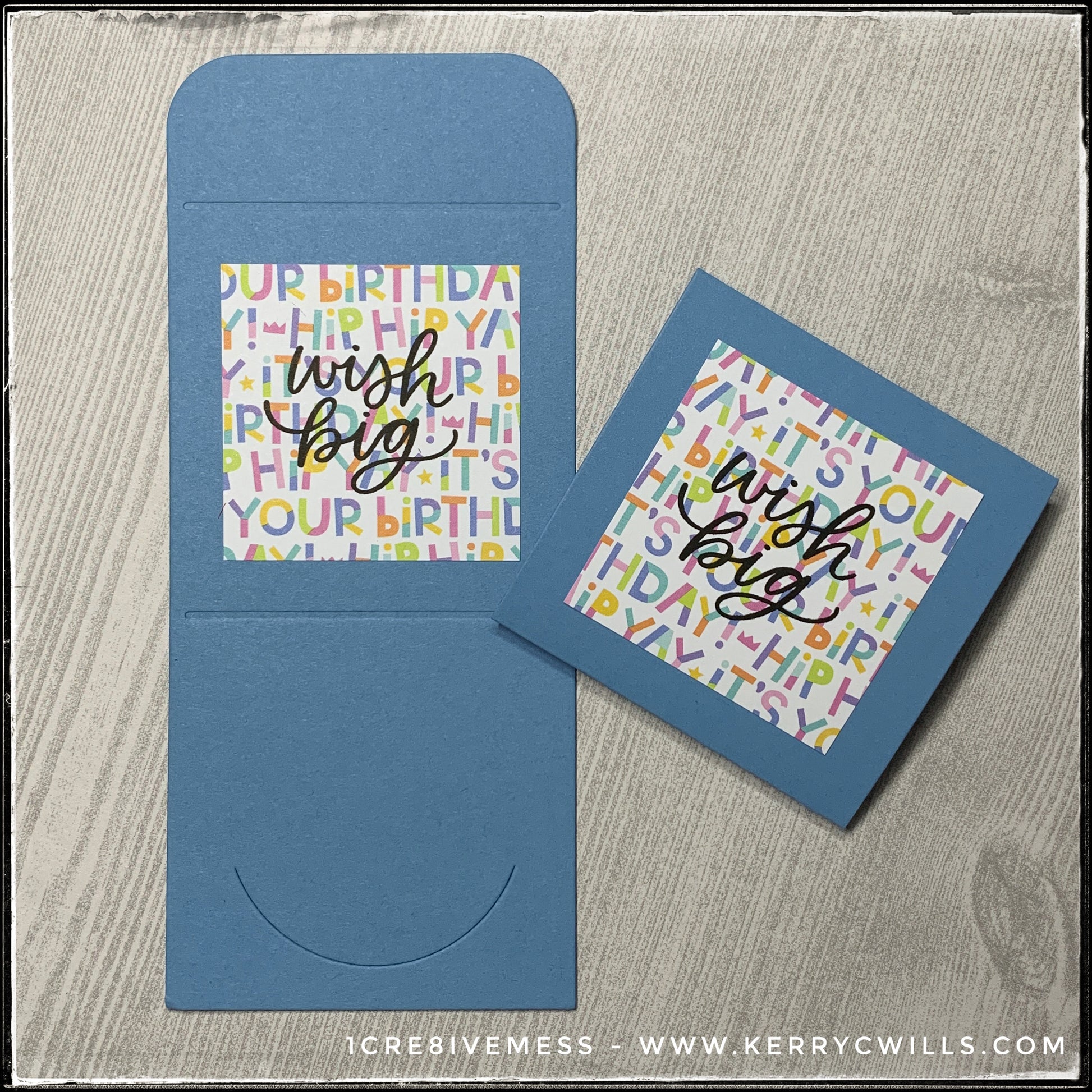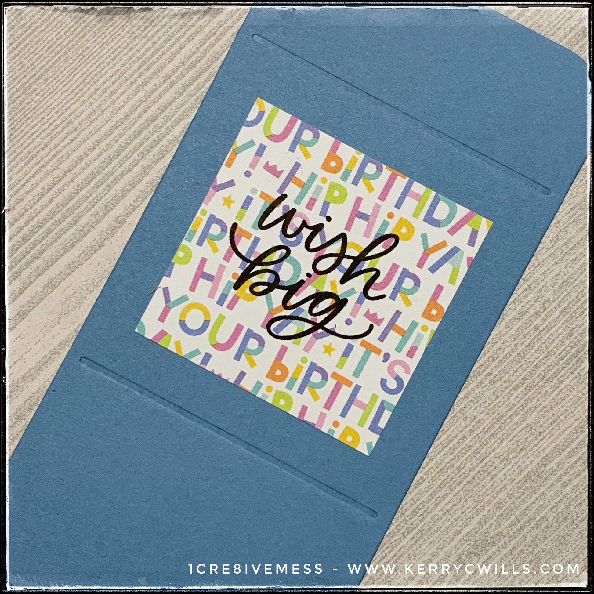 A festive background of colorful birthday sentiments is highlighted by the stamped sentiment "wish big" in black ink on the center of this lunchbox note.