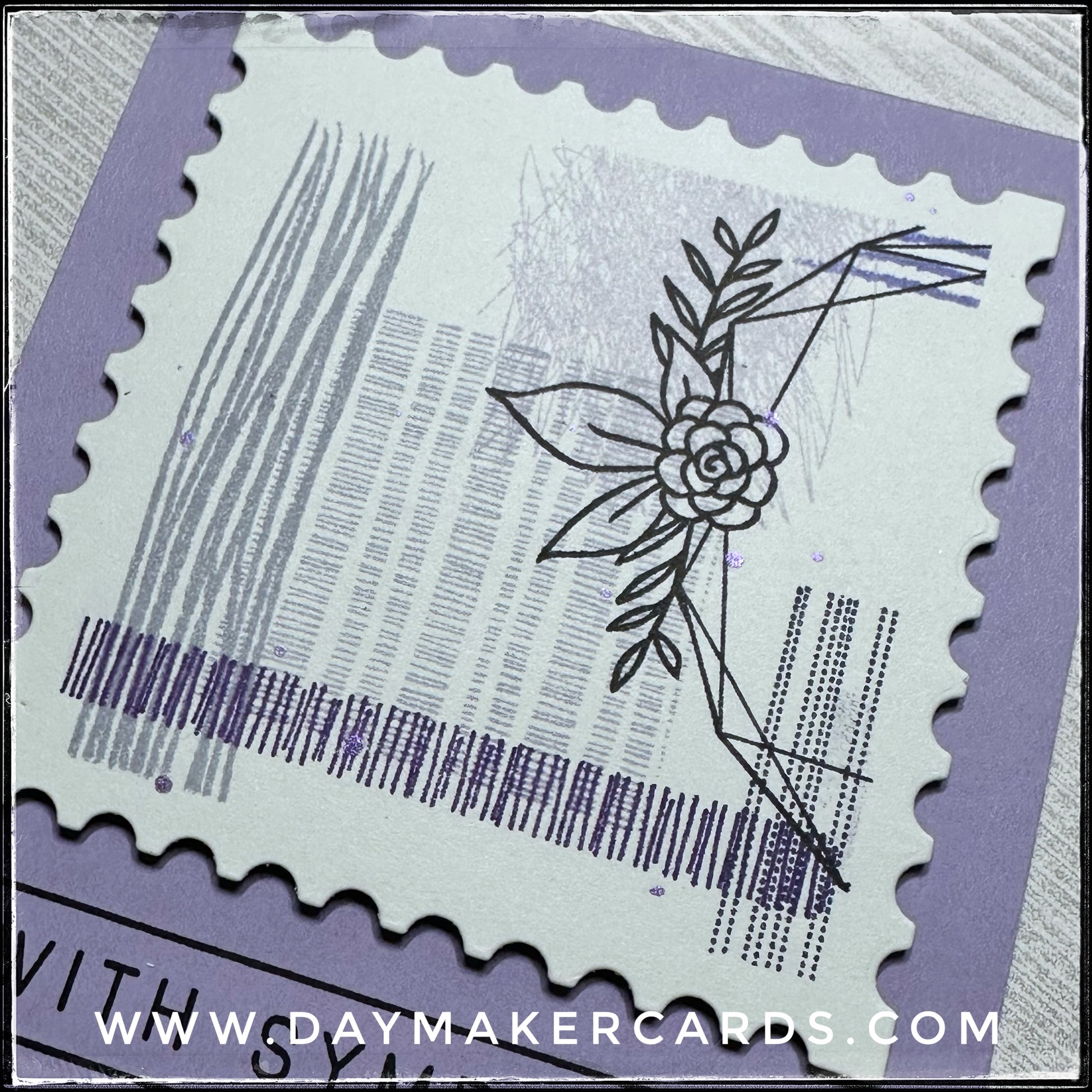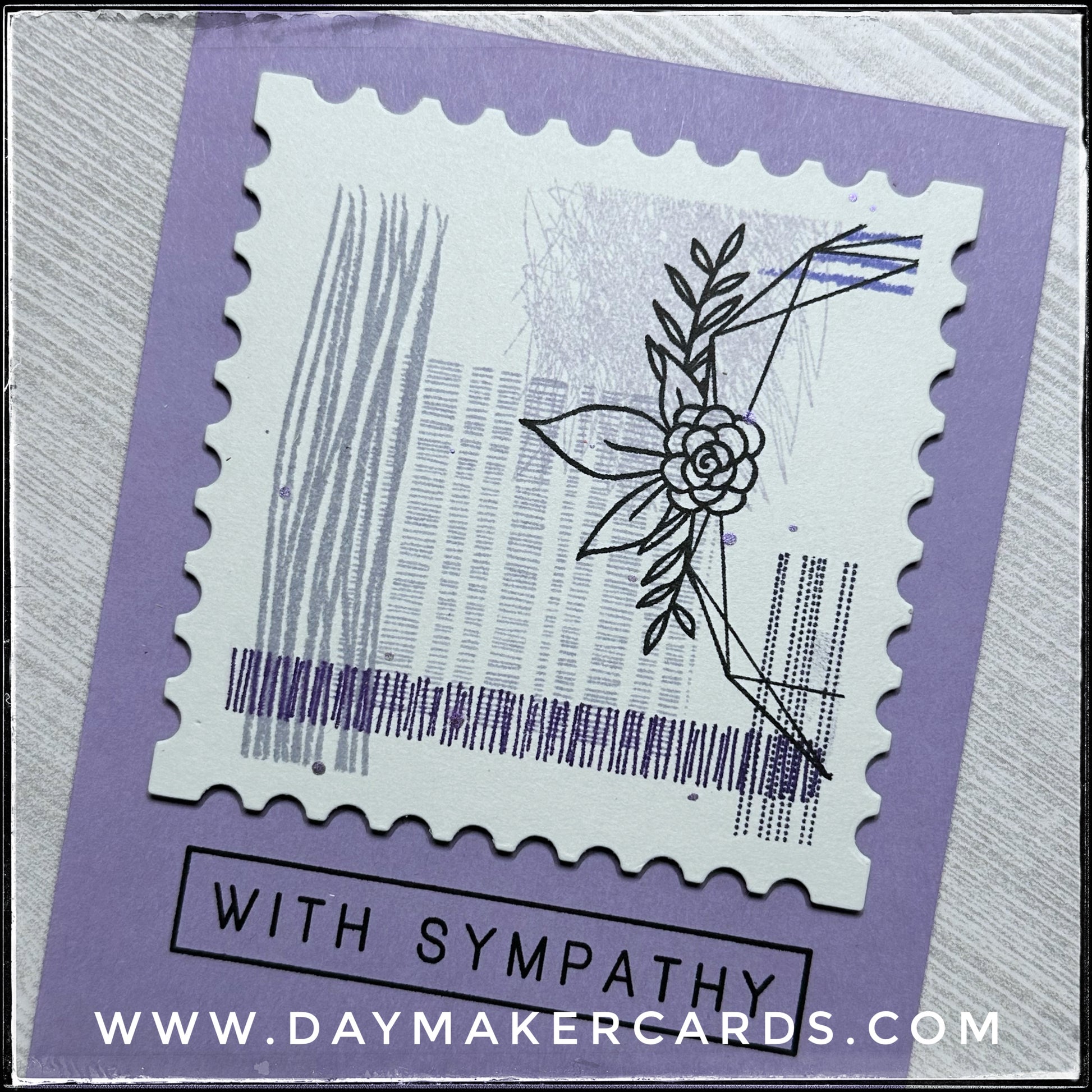 A die-cut square resembling a postage stamp is centered near the top of the card front and is elevated off of the card base with dimensional adhesive. The design features overlapping lines in various lengths, widths and patterns, complete with the image of a line-drawn flower. Beneath the die-cut square is the sentiment, stamped in black ink and reading "with sympathy" inside a thin lined box. A splattering of purple flecks adds just the right amount of something extra.