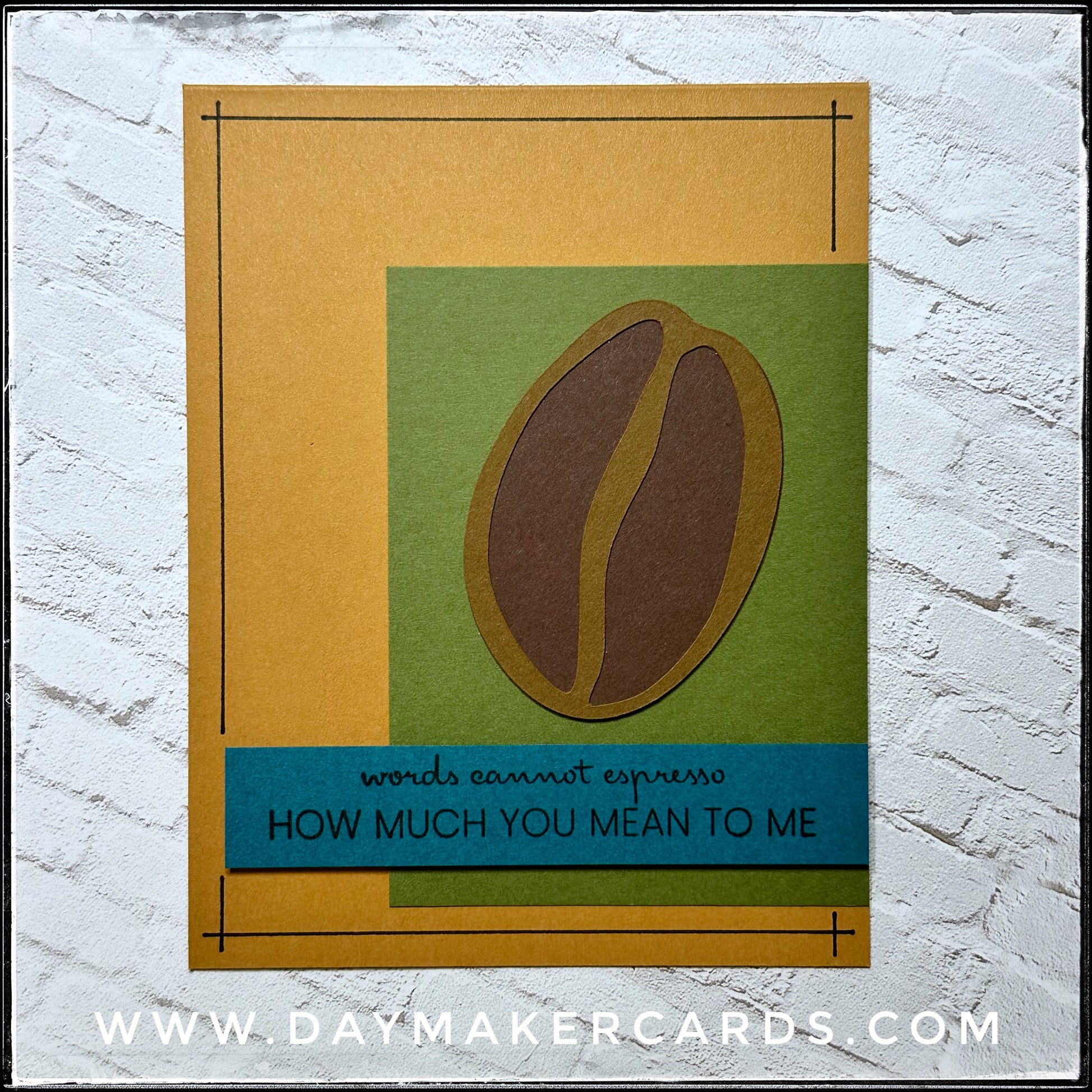 Thin hand-drawn lines surround the perimeter of this card front and help to highlight the large die-cut espresso bean that accents the sentiment reading "words cannot espresso how much you mean to me" and is stamped in black ink. The block with the sentiment is elevated off of the card base with the use of dimensional foam adhesive.