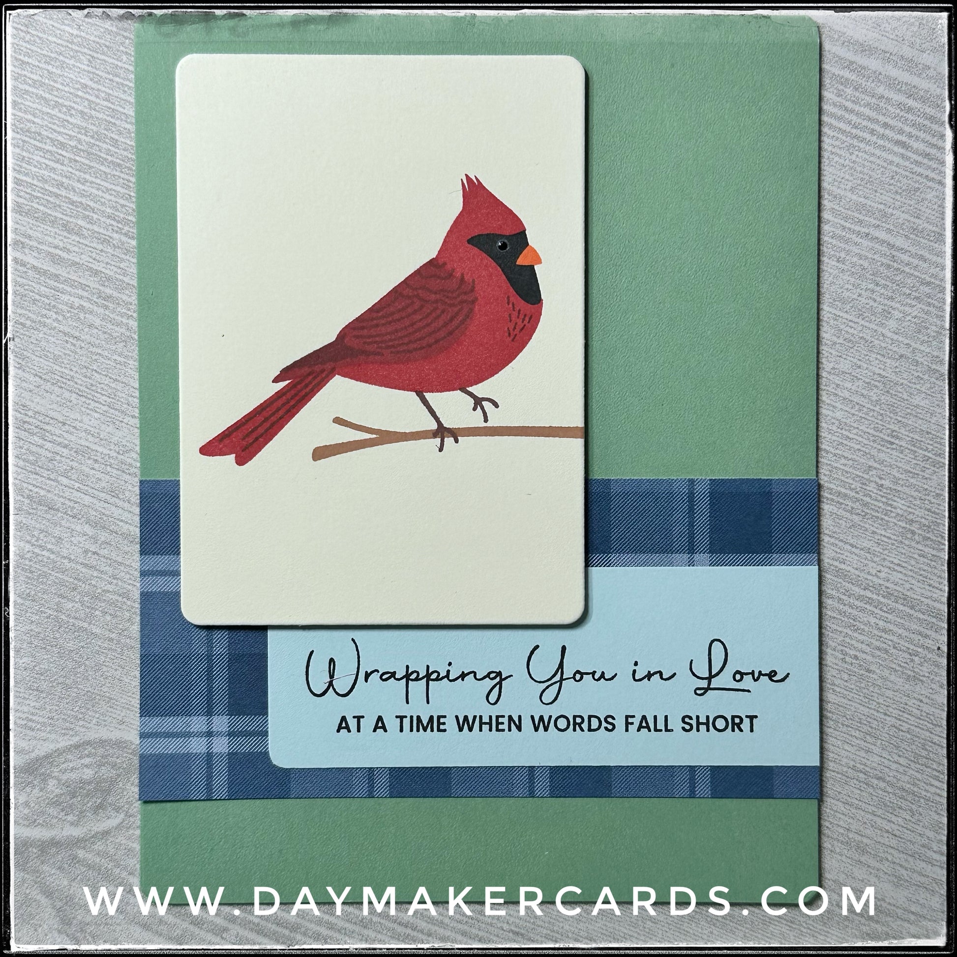 Depicted as if it is standing on a branch, the die-cut rectangle the image is on is elevated off of the card base with dimensional adhesive. Layered over a plaid patterned block is a strip hosting the sentiment, "Wrapping You in Love at a time when words fall short" which is stamped in black ink. The corners have been slightly rounded.