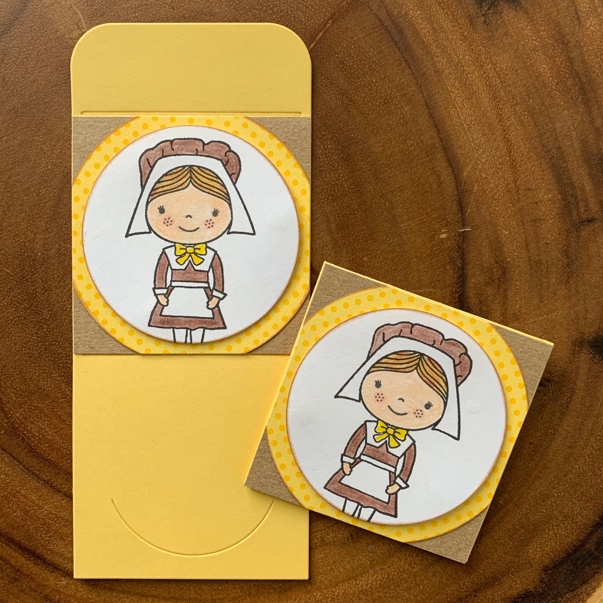 The image of a woman pilgrim is stamped on a large white circle and has been hand-colored. The circle is elevated off of the note base and is layered on a yellow tone-on-tone polka dotted circle.
