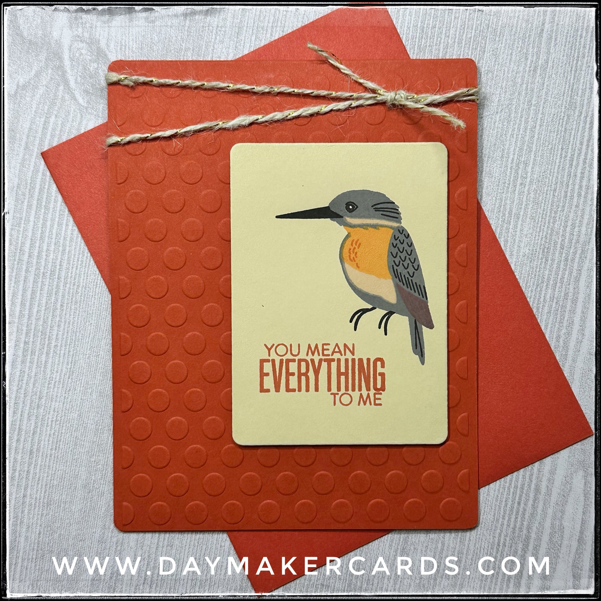 The background of the card front has been embossed with a polka dot texture which is visible from the inside of the card. Two strands of cream twine with gold accents are wrapped around the front of the card and are tied in a knot near the right side. "You mean everything to me" is stamped in the same color as the card base near the bird image. All four corners are given a slight rounding.