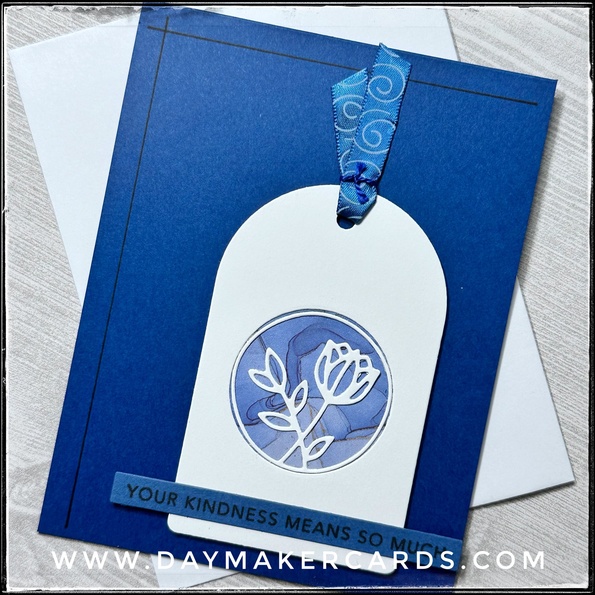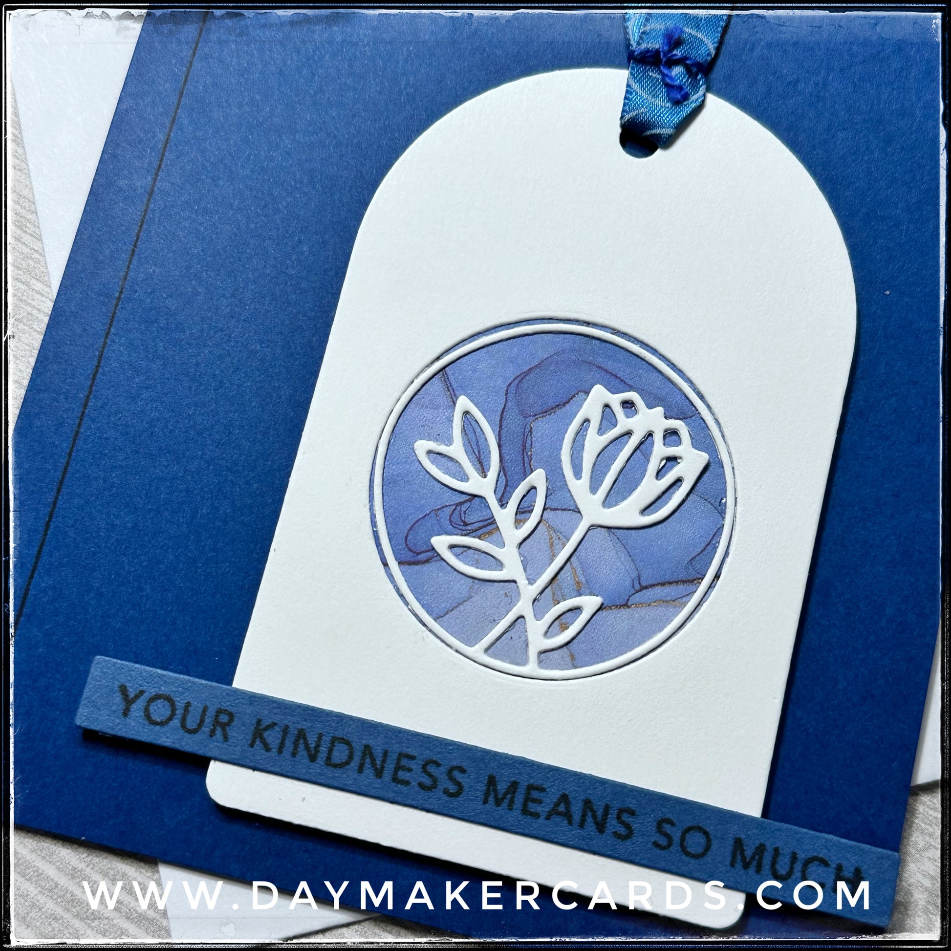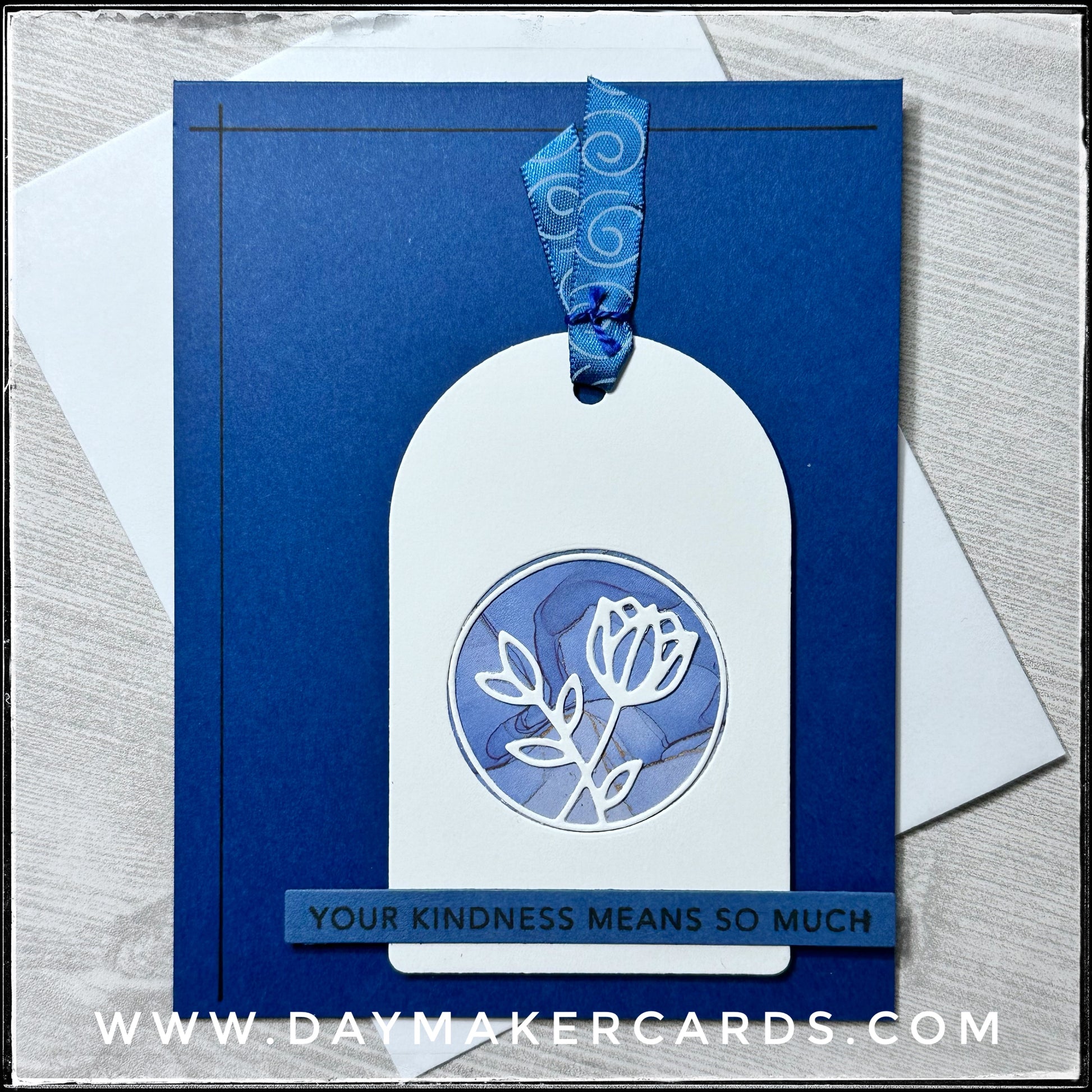 "Your kindness means so much" is stamped in black ink on a thin blue strip which coordinates with the background color shown behind the floral die-cut. The tag is elevated off of the card base with dimensional adhesive and white swirls fill a blue ribbon accent. Two intersecting thin hand-drawn lines add detail on the top and left sides of the card front.