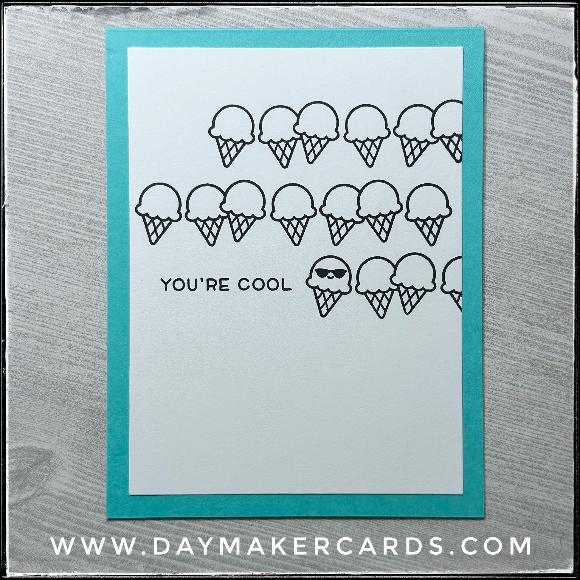 Three rows of ice cream cones appear to be dancing across the front of this handmade card. Accented by a pair of cool sunglasses, the ice cream cones are lined up near the sentiment which reads "You're Cool" and is stamped in black ink. All the images are stamped in black ink on a white card panel, made of heavy cardstock.