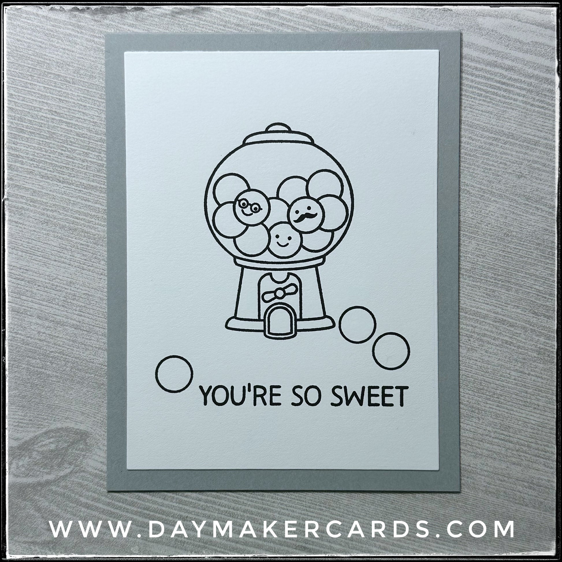 Full of gumballs, [some even with adorable faces & fun personalities!] this sweet machine design fills the card front. The sentiment stamped in black ink reads "You're So Sweet" and is accompanied by a trio of loose gumballs.