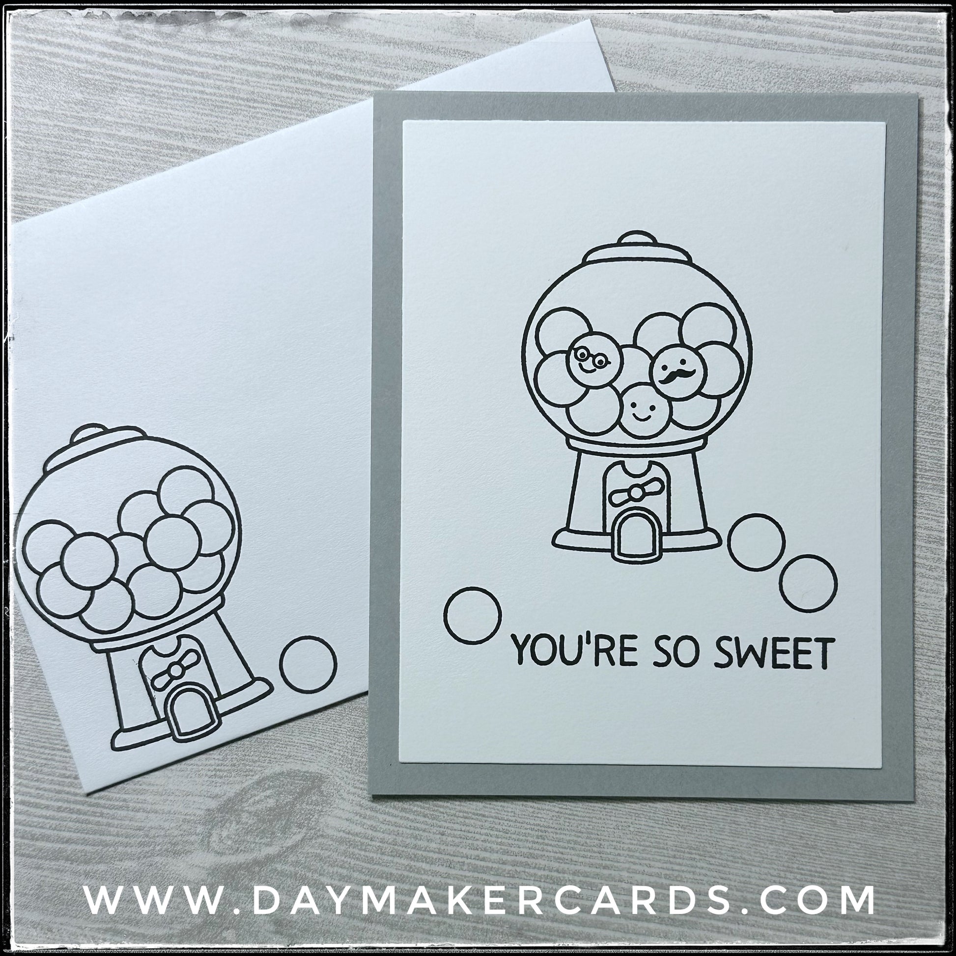 The included white envelope is designed to coordinate with the card, featuring another machine and gumball.